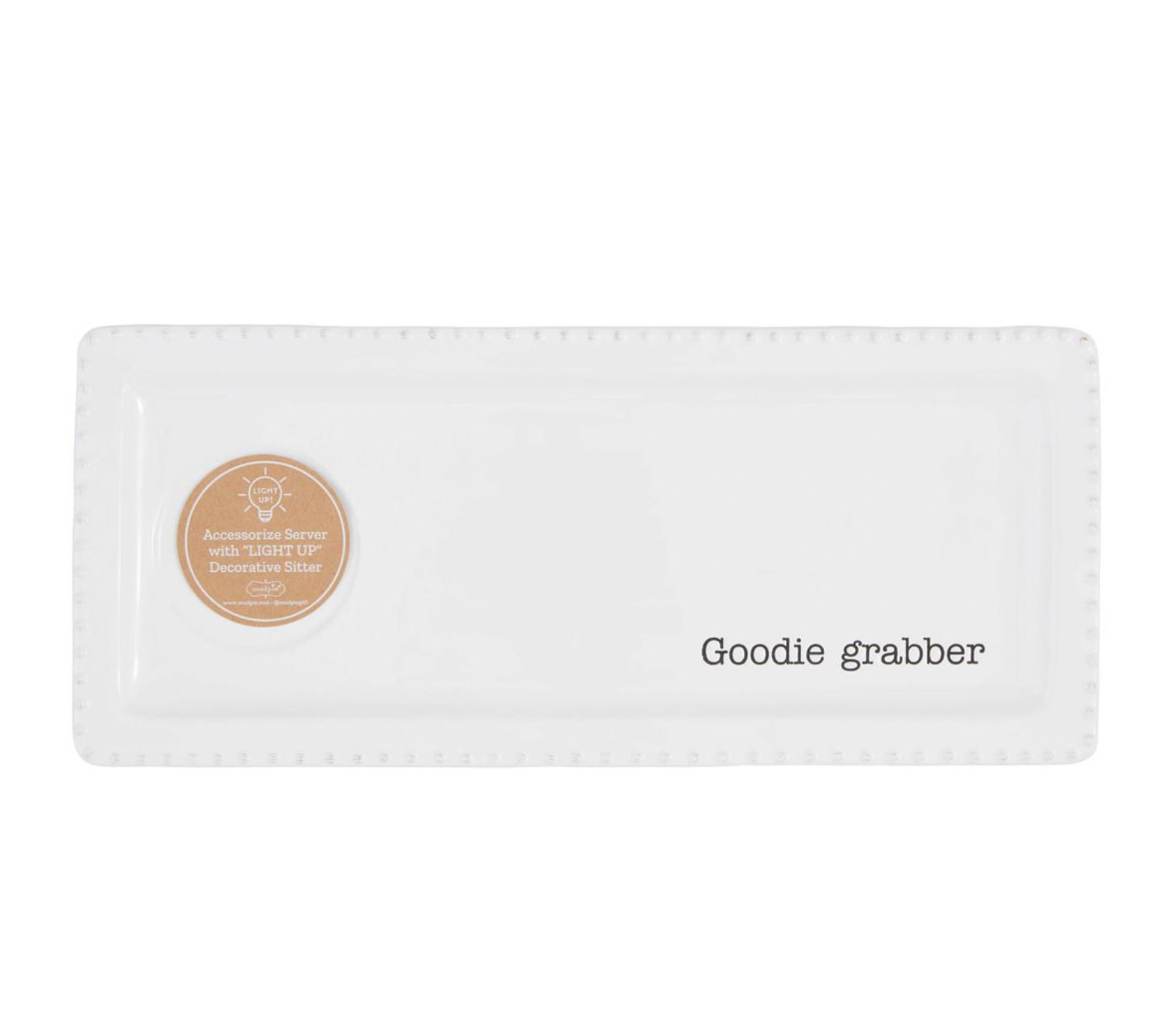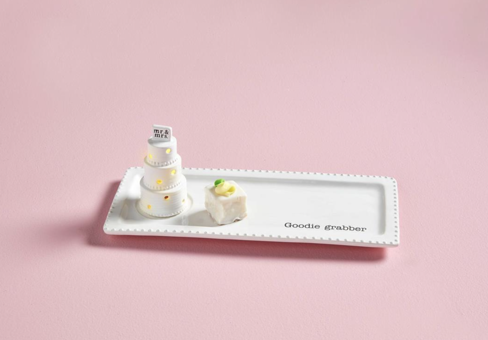 Beaded ceramic tray with surface well to hold decorative light-up sitters.
