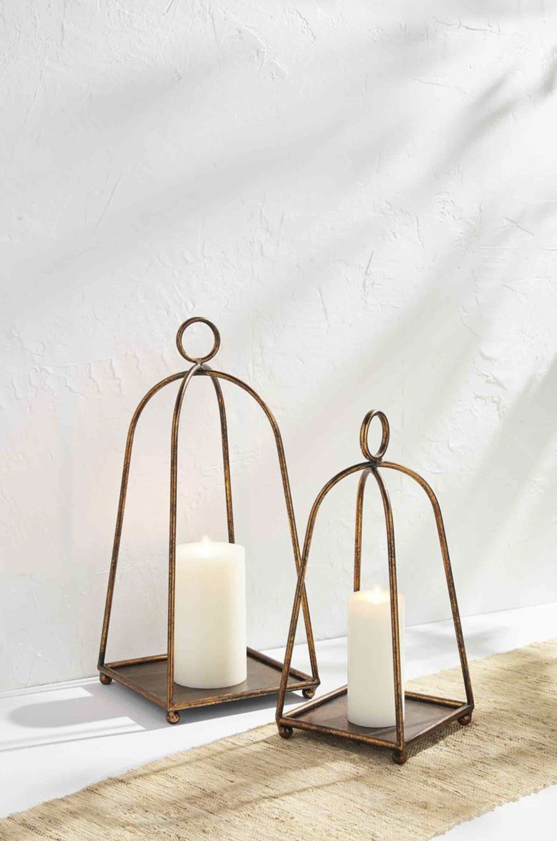 Brass metal antiqued lanterns with ring finials.