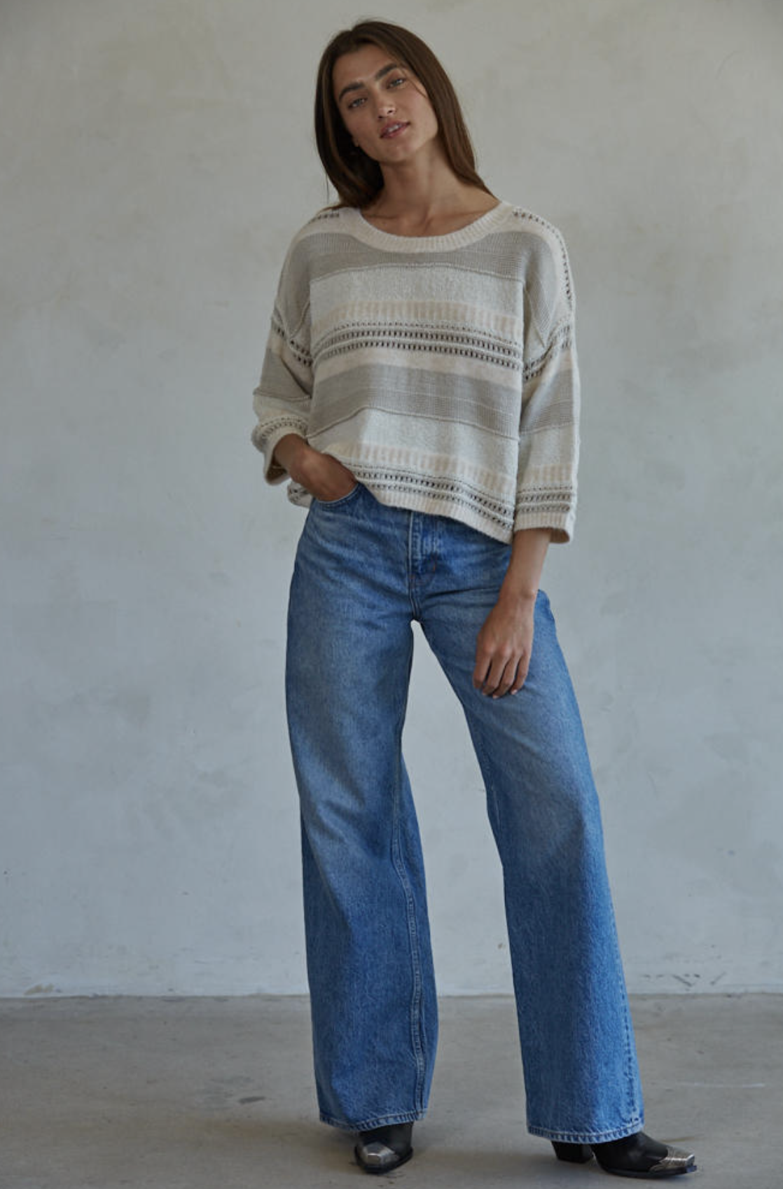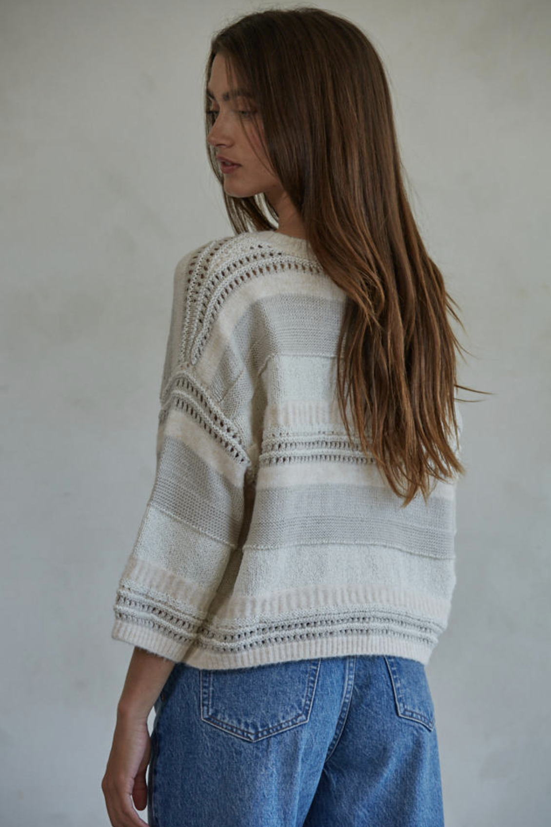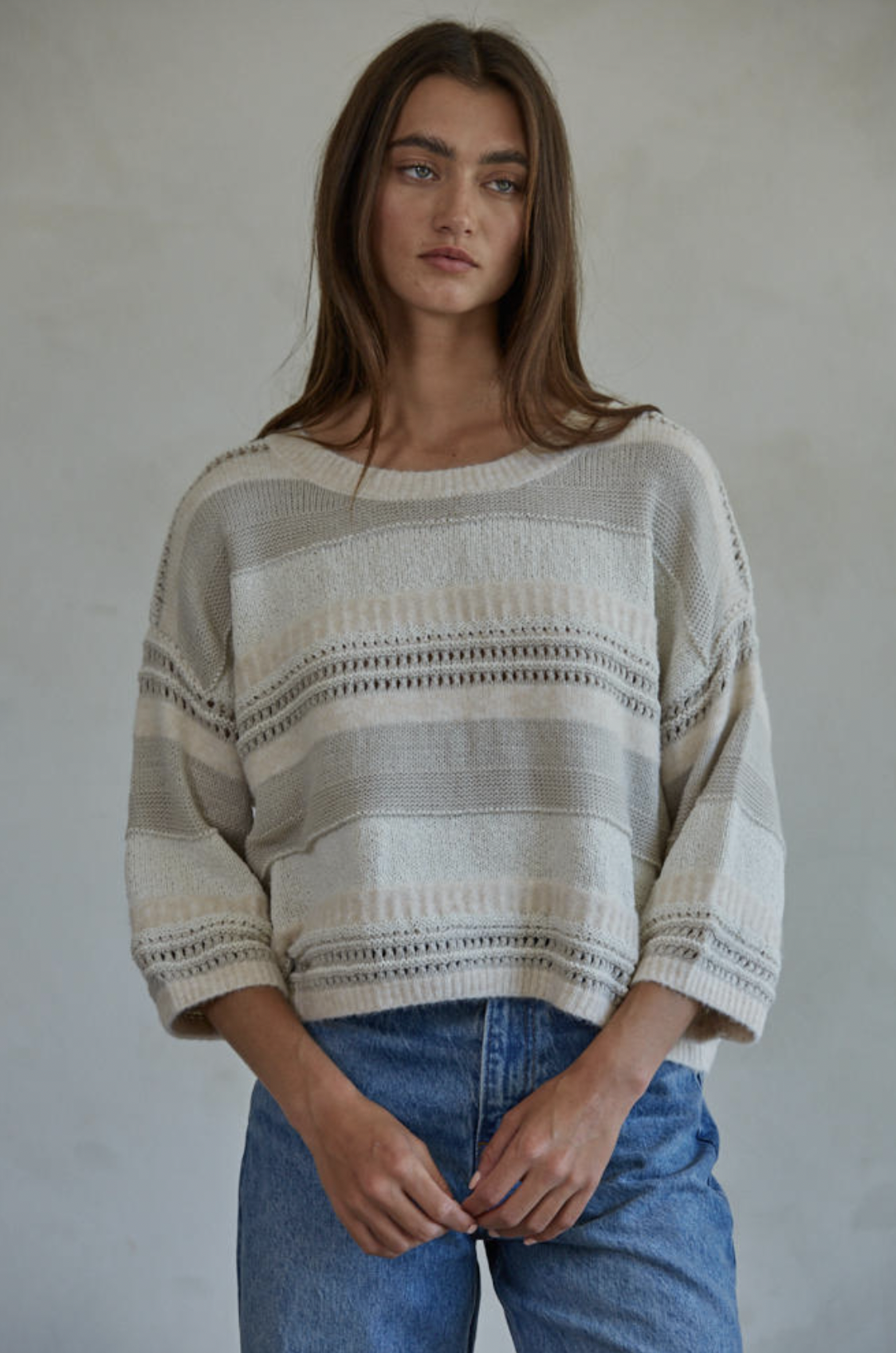 Knit Striped Sweater Round Neck 3/4 Sleeve Top