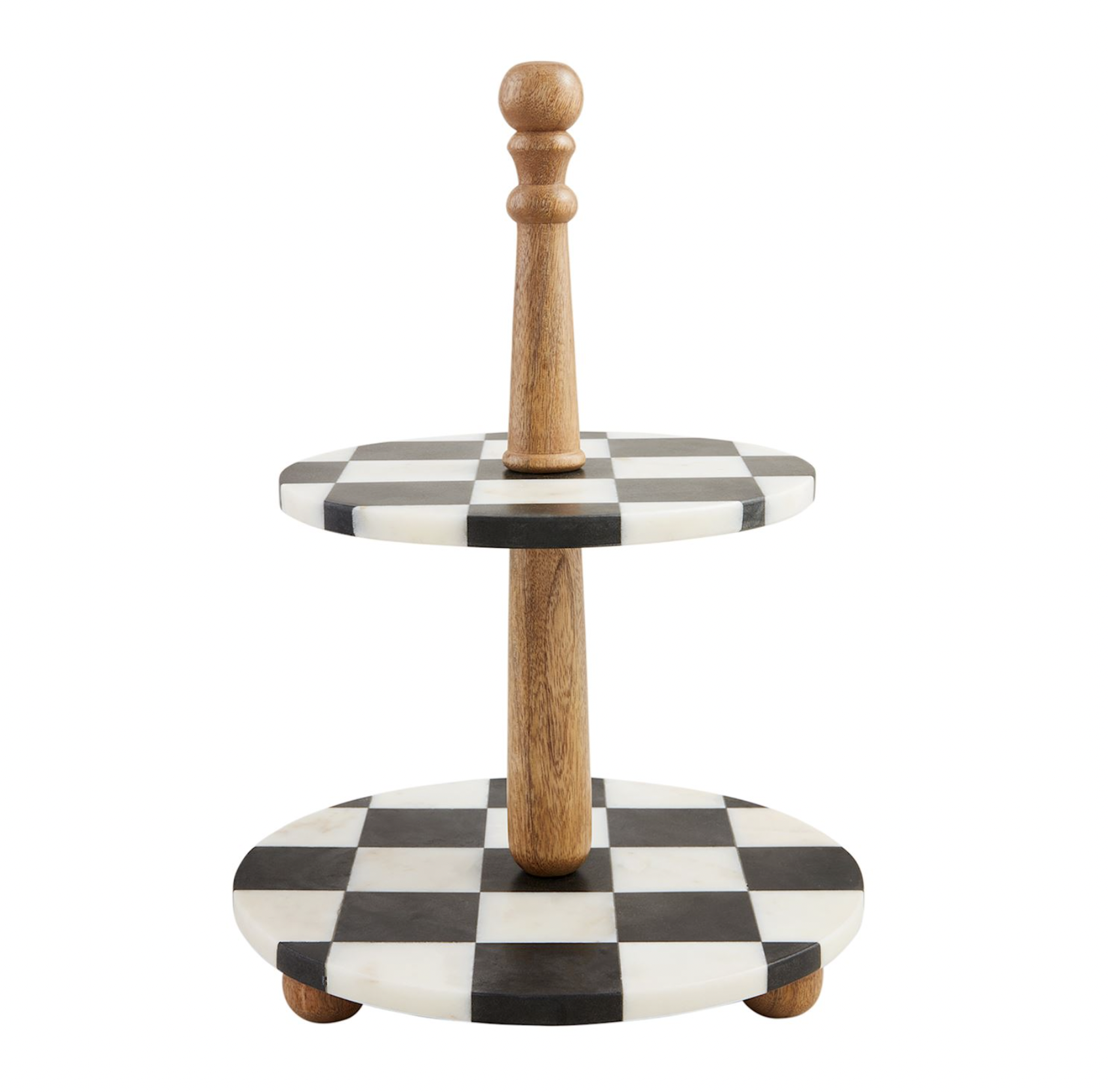 Checkered marble two-tier server with mango wood center dowel. Knocks down for storage.