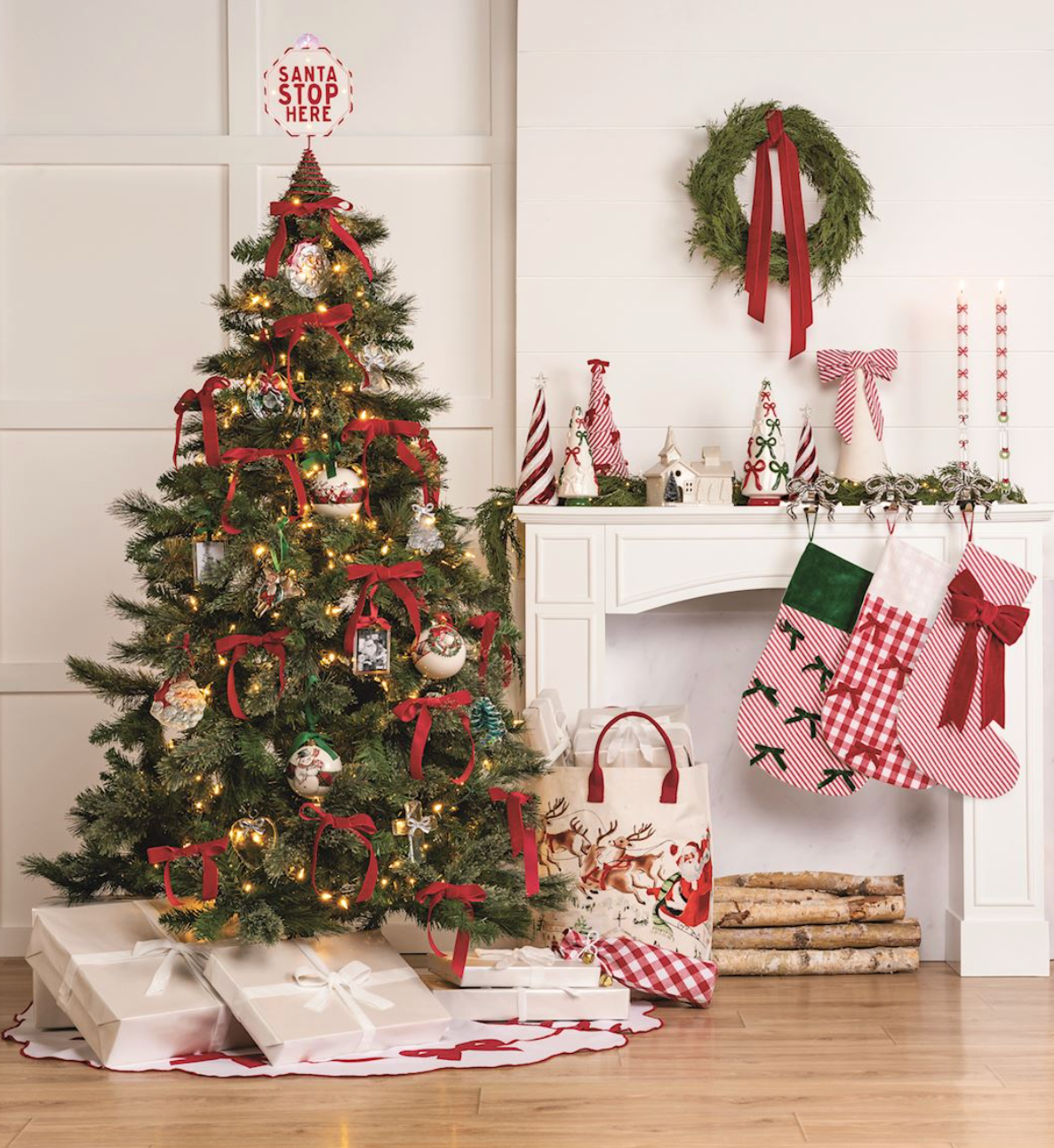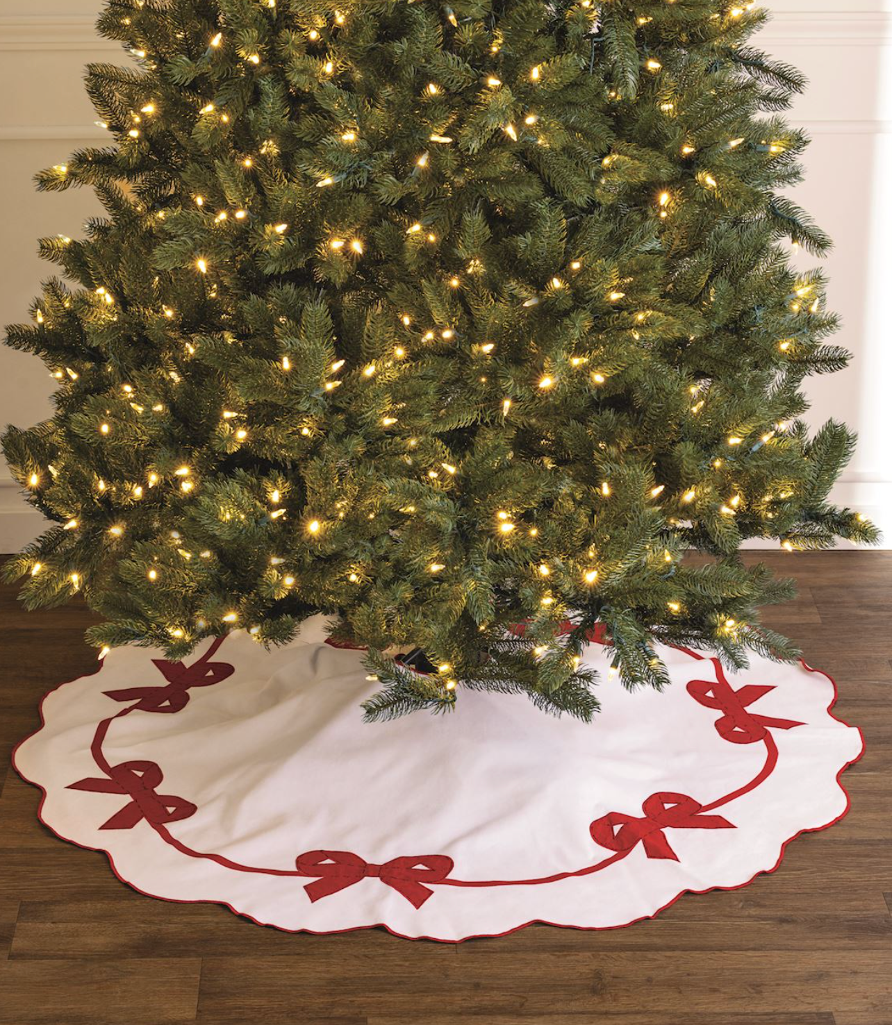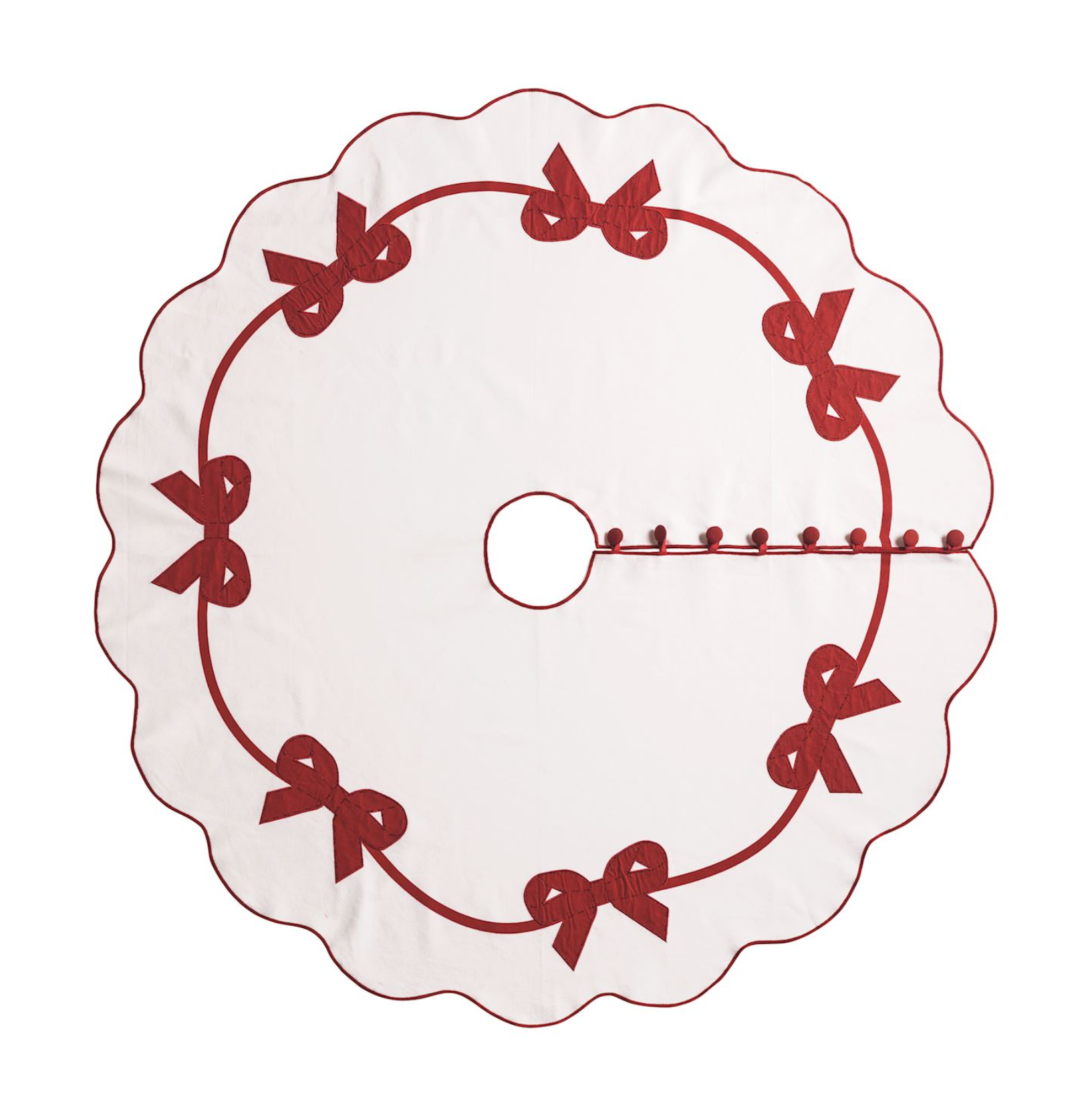 Cotton tree skirt features embroidered edge appliqued bows and covered buttons.