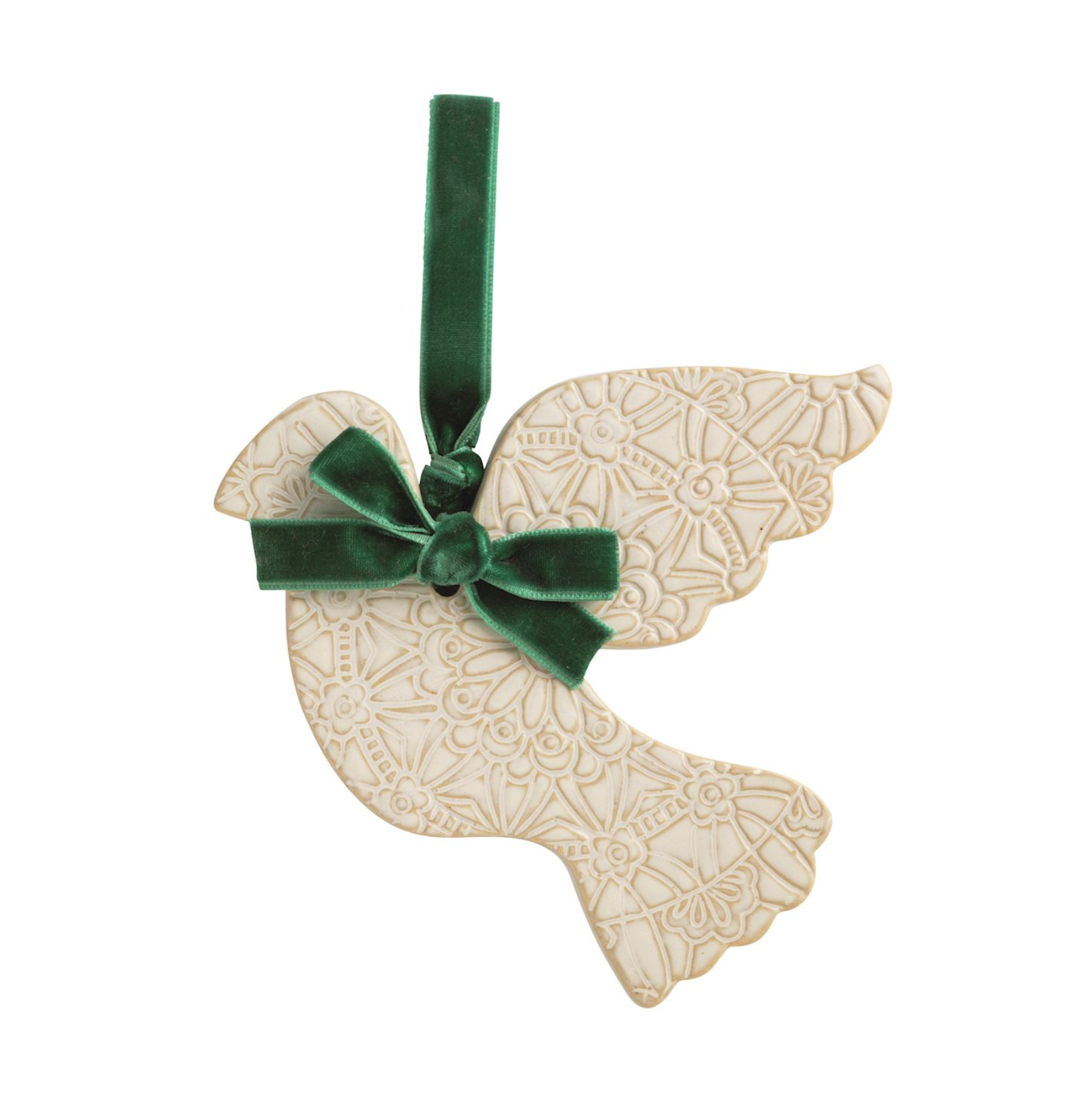 Milk glazed stoneware ornament with pressed lace detail. Velvet bow hanger.