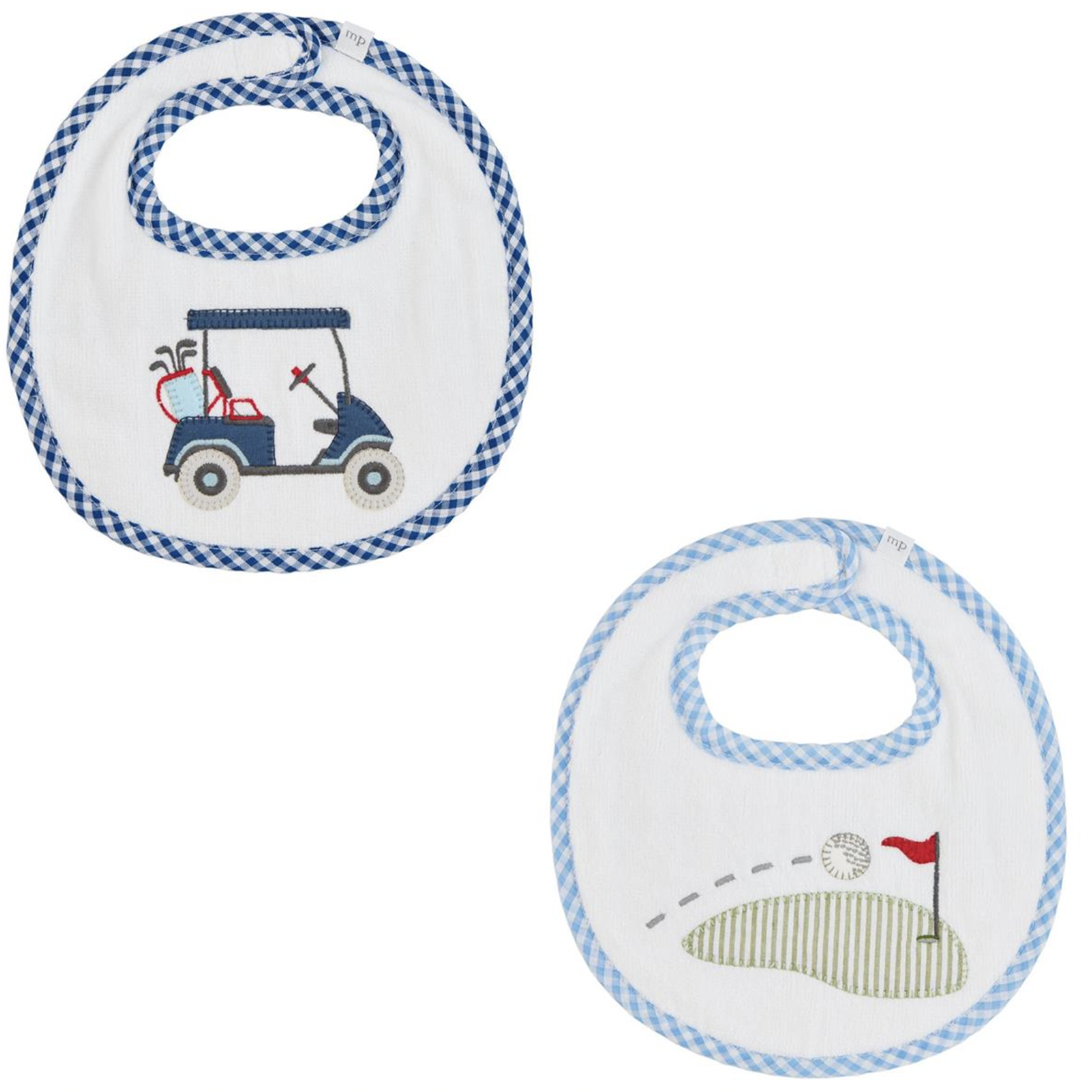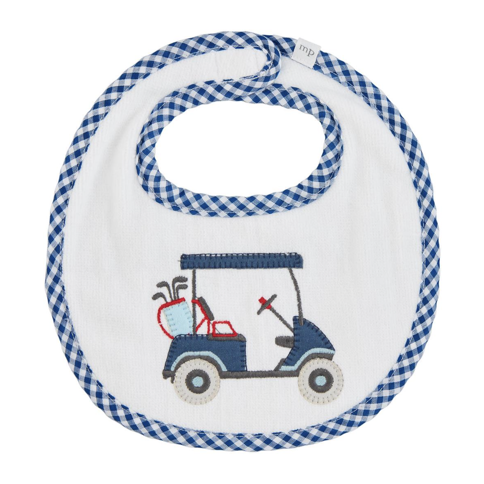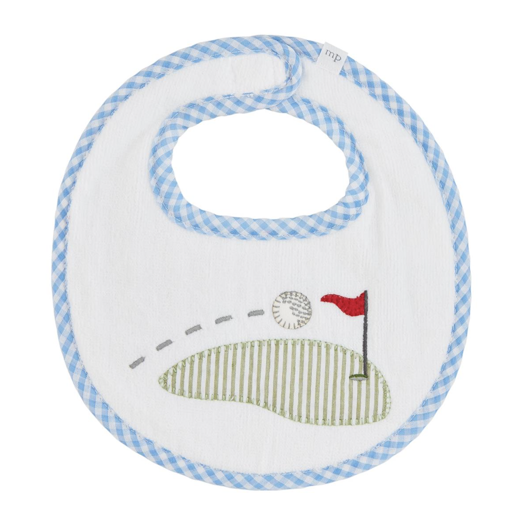 Appliqued velour terry cloth bib with contrast gingham binding and hook and loop closure.