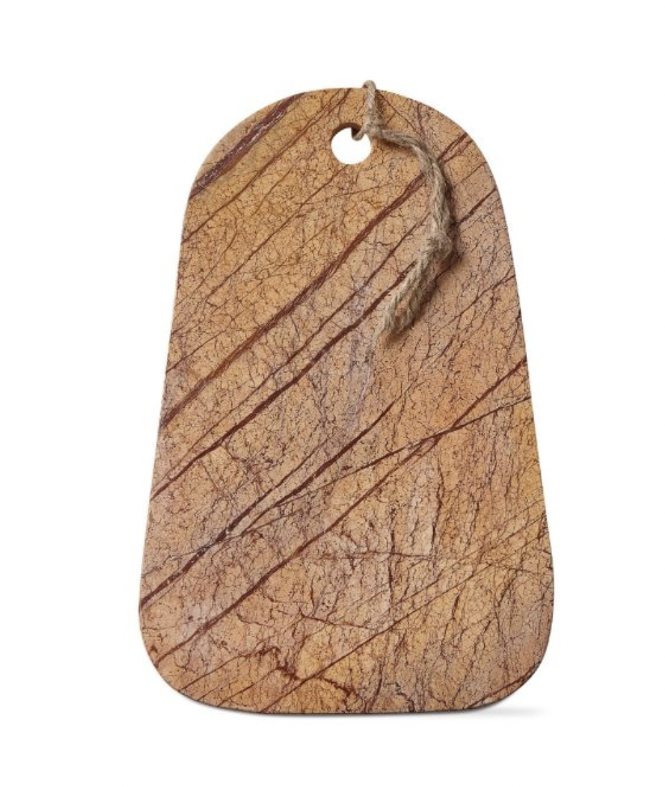 Marble is timeless. Add a premium touch to your entertaining essentials with this gorgeous, artisan-made marble board. Impress your guests with a dramatic charcuterie board presentation of bread, cheese, cured meats, and so much more! Features beautiful handcrafted brown earth marble, with jute rope for hanging. Individually polished and finished by hand. Variations in the color and veining of the marble are expected, making every board a singular work of art.