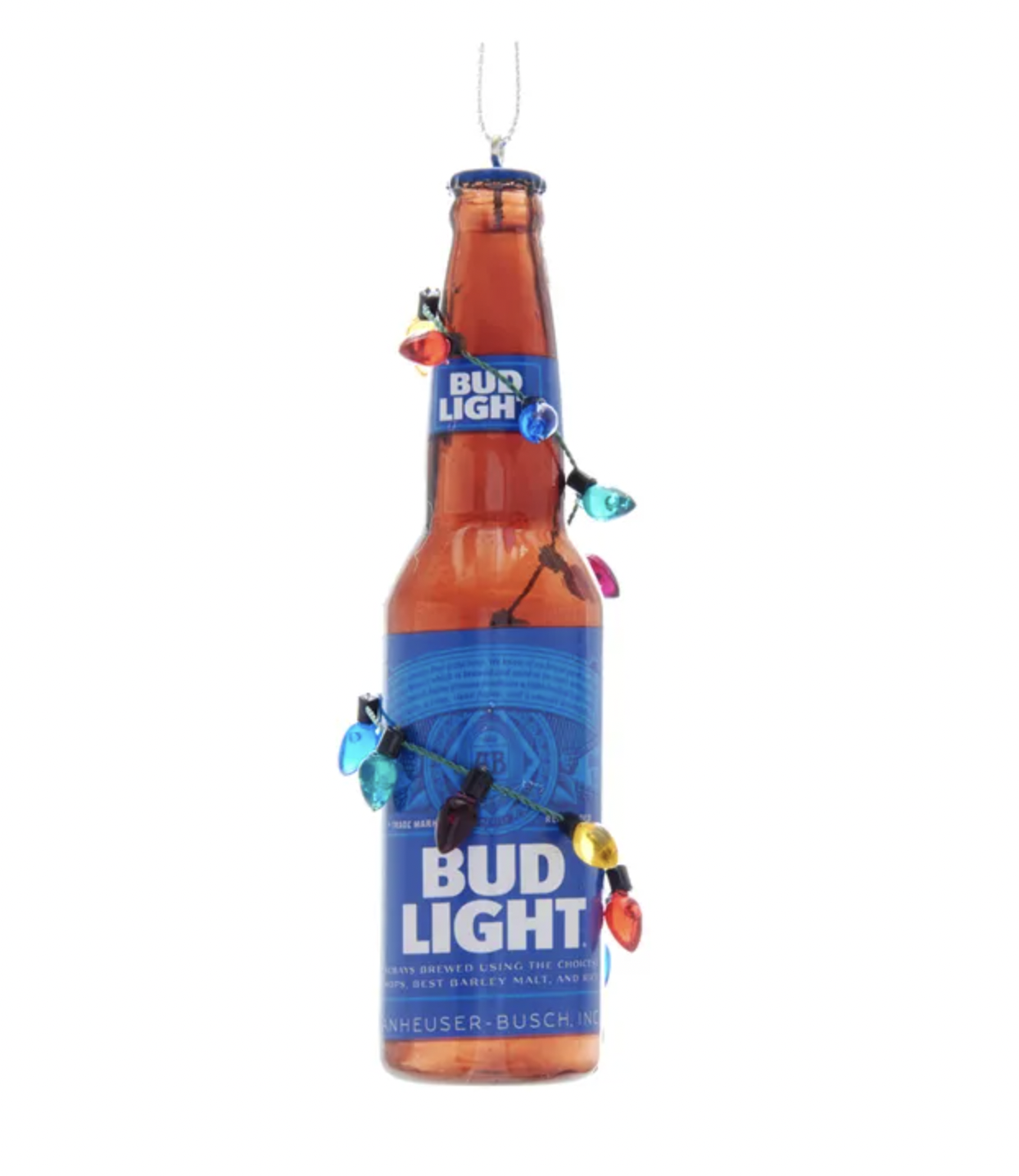 This Kurt Adler Budweiser® Bud Light bottle ornament is a fun, unique way to add to your holiday décor! This ornament features the blue Bud Light label and logo around the neck of the bottle and festively decorated with a string of Christmas lights