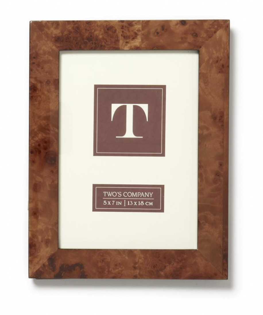 Glossy burl wood veneer surrounds timeless memories in this clean-lined 5" x 7" gallery frame