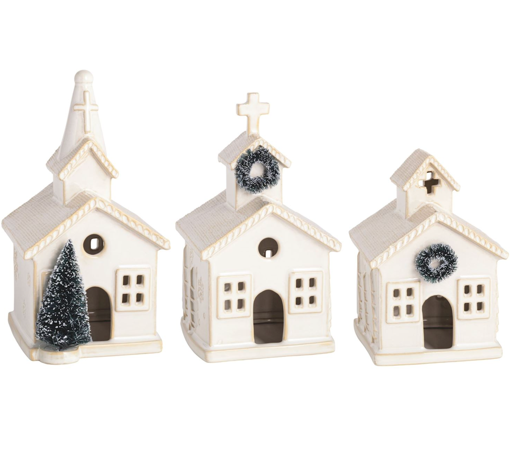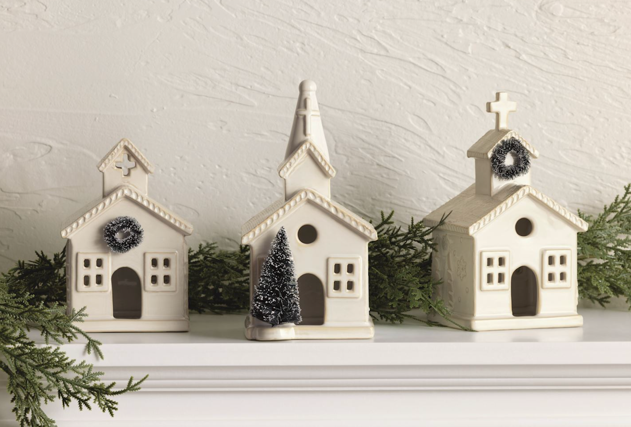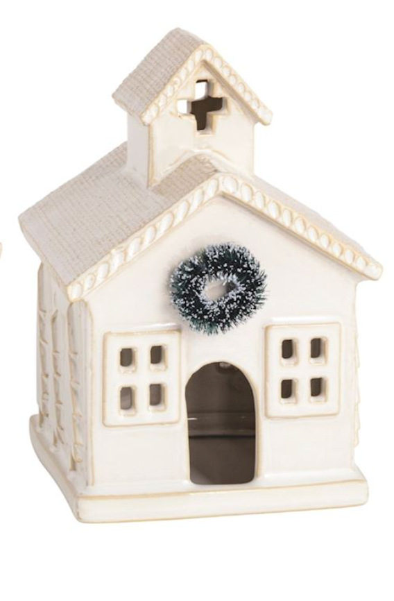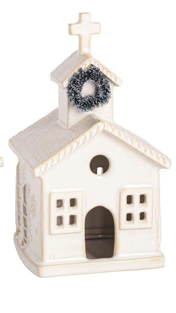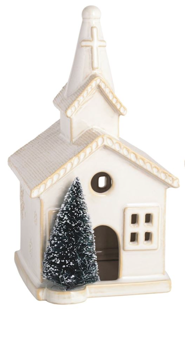 Milk glazed stoneware church sitter features bottle brush wreath or tree detail and pierced openings for light to shine through. Place over flameless tea light to light it up!