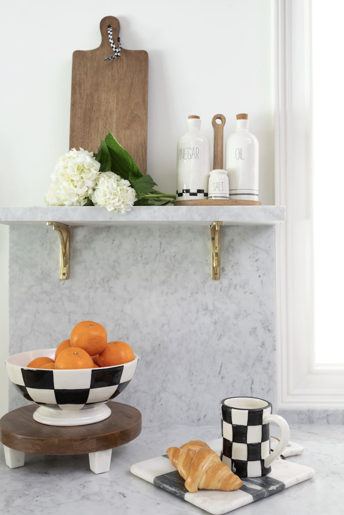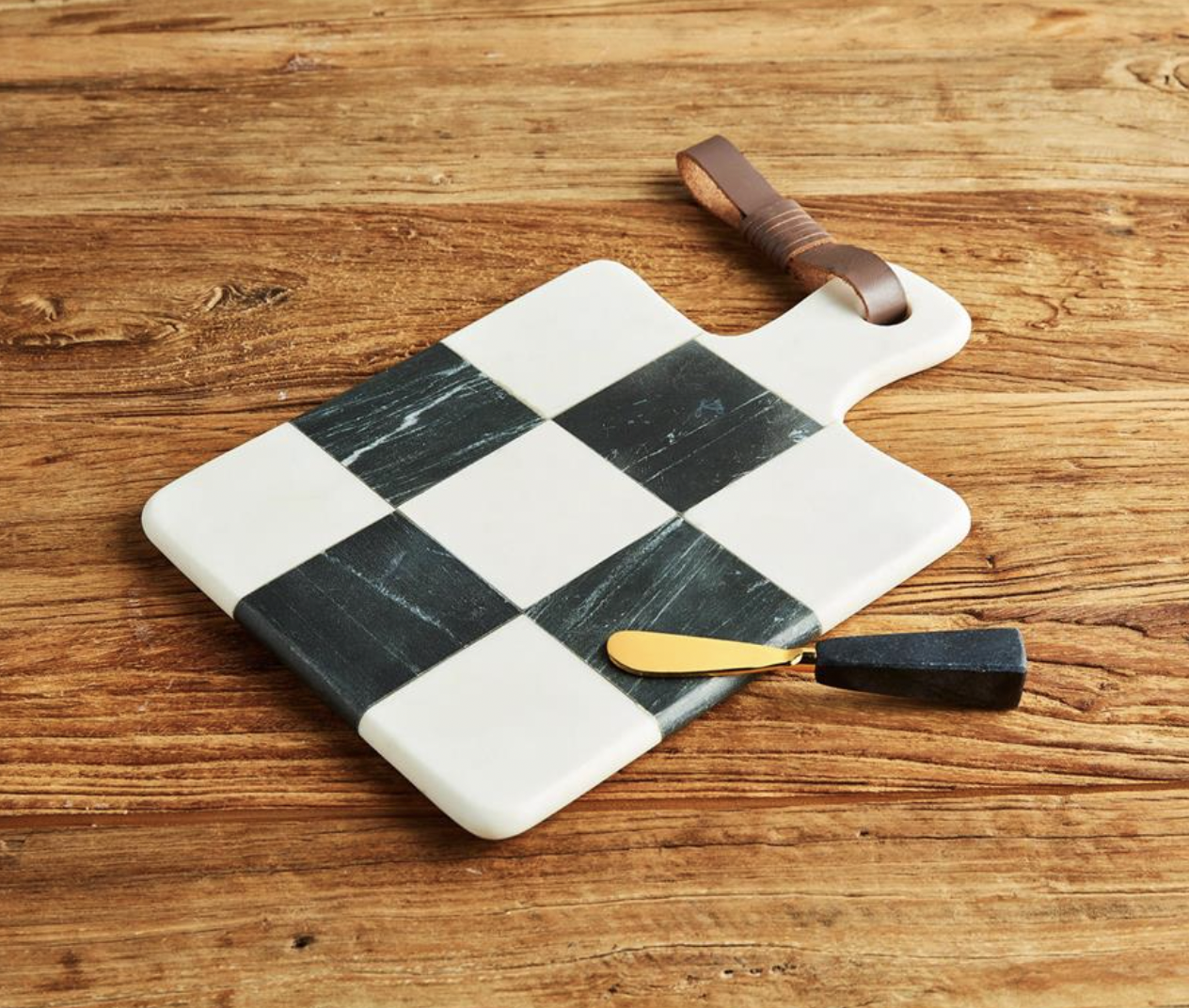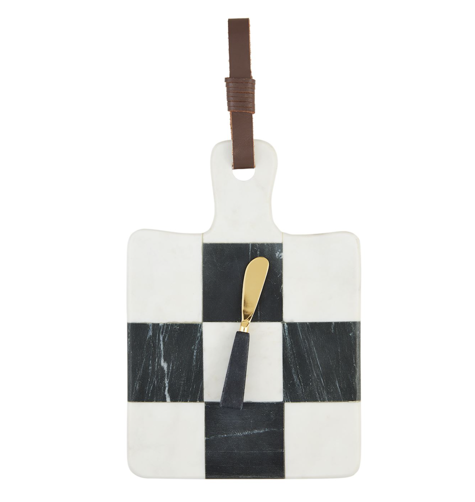 2-piece set. Checked marble paddle board. Comes with brass finished coordinating spreader.