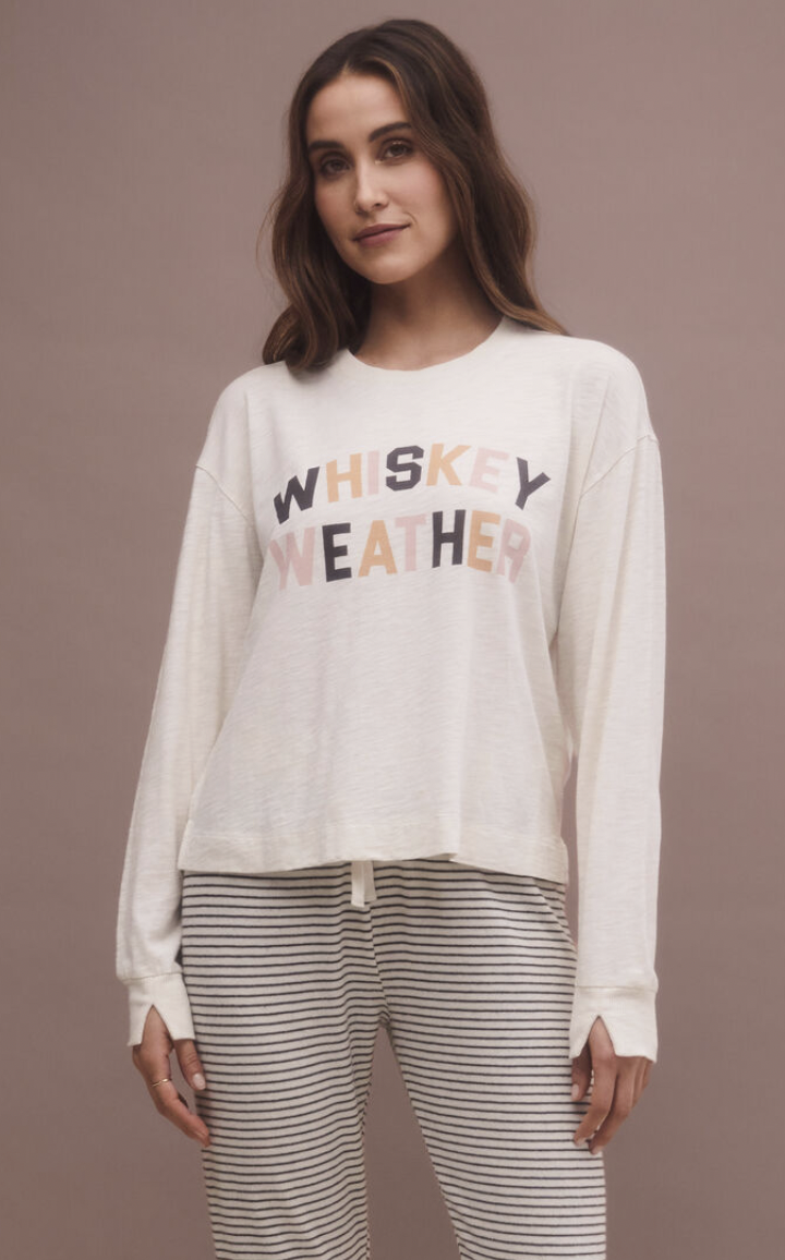 When there’s a slight chill in the air, we know it’s ‘whiskey weather!’ This new Chill Whiskey Long Sleeve Tee is made using our ultra soft and lightweight Brushed Slub Jersey fabric you just have to feel. Semi-sheer, this relaxed, boxy crew neck tee has a vintage, worn-in feel and features printed letters in fall-inspired colors on the front. Vent slits add a fun touch. Fabric Content: 55% Cotton 45% Rayon