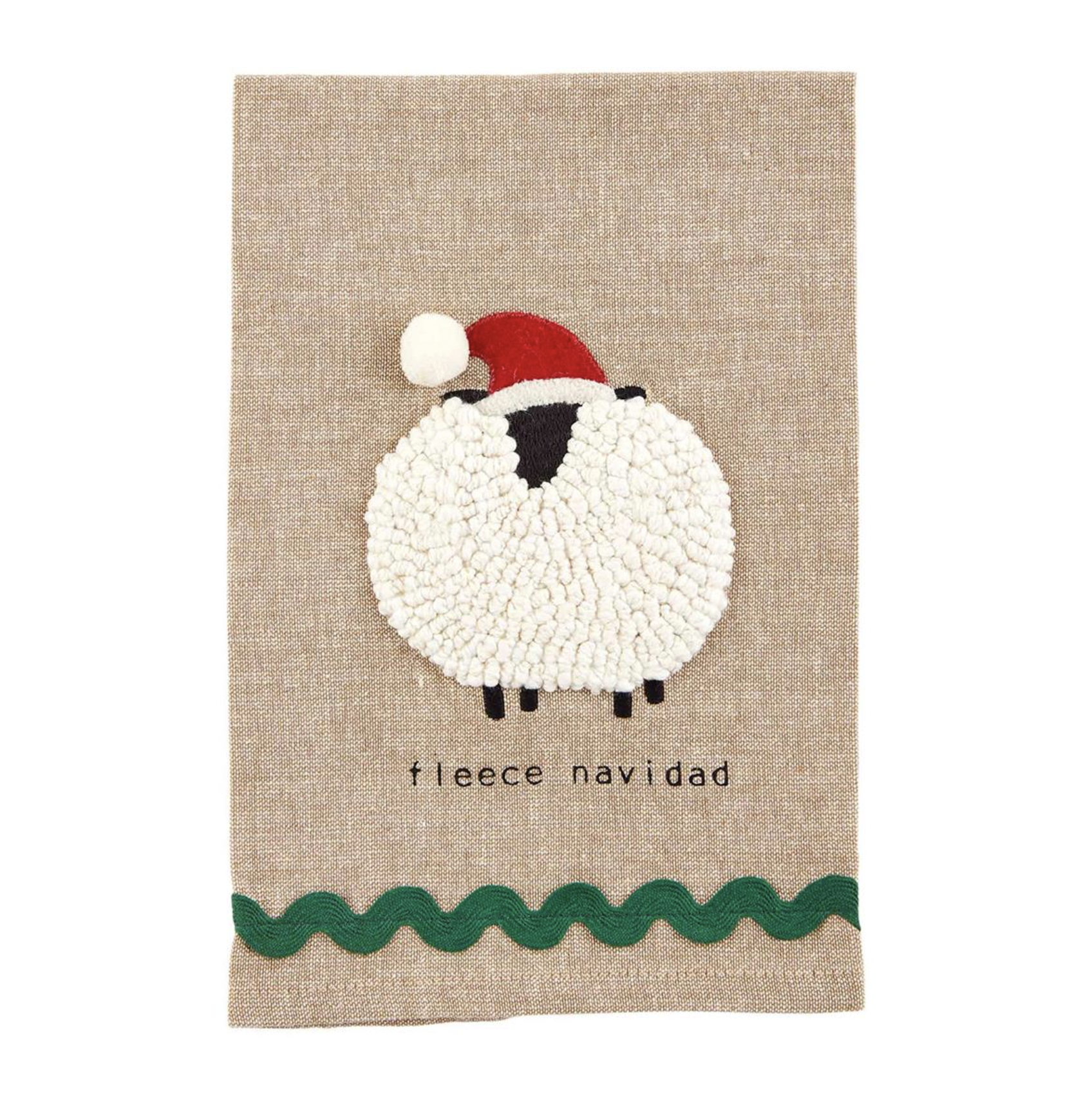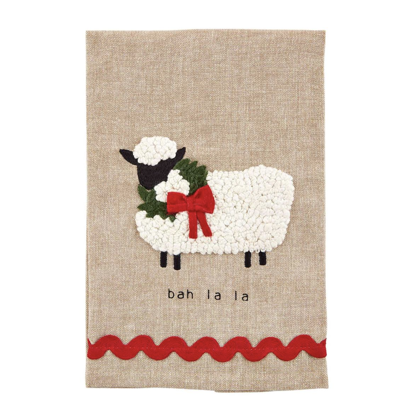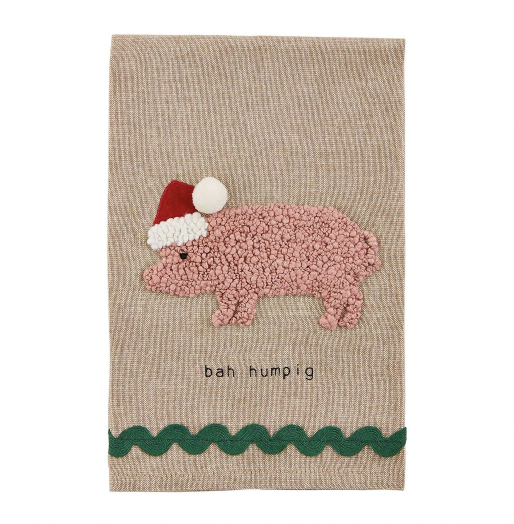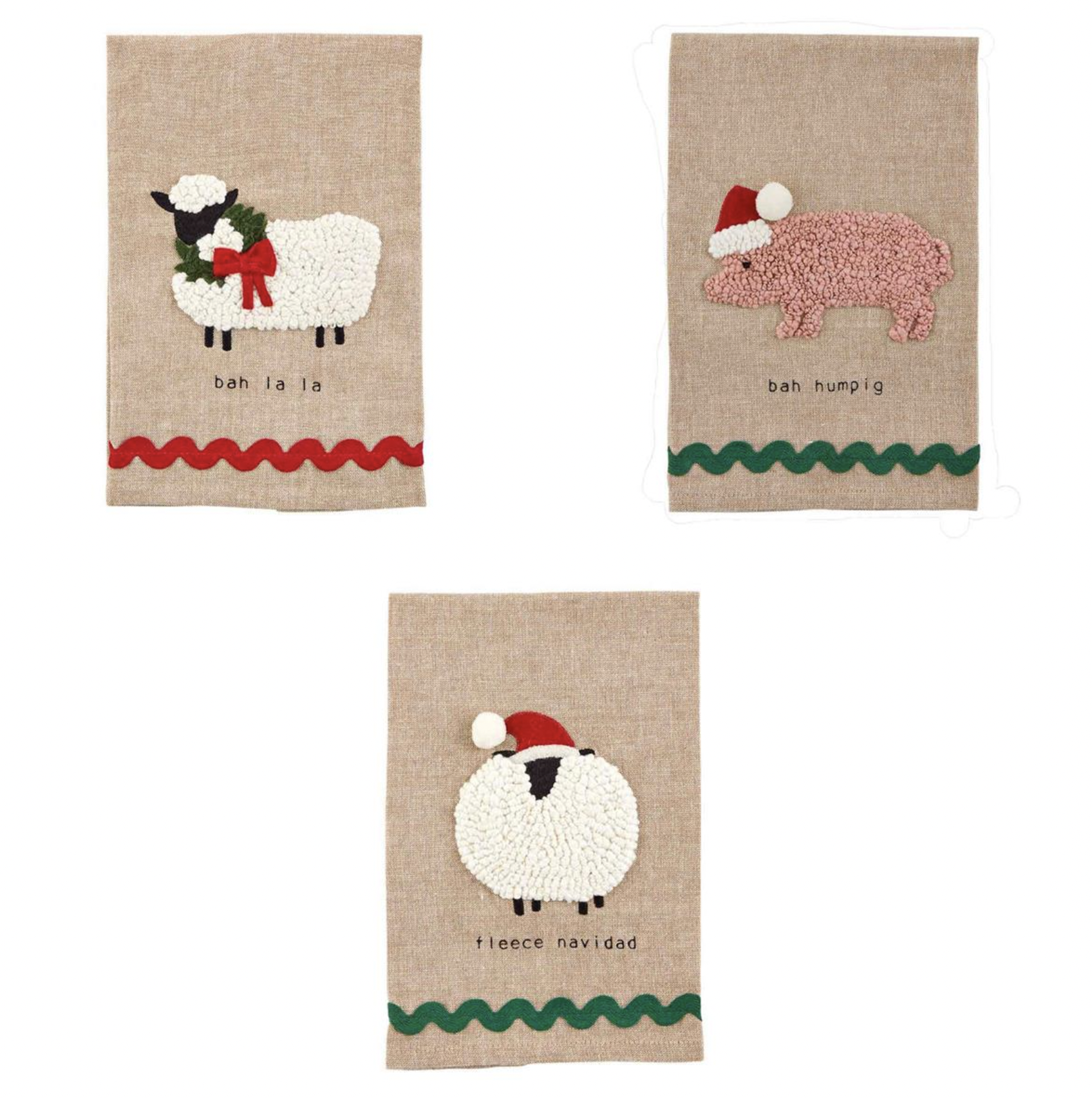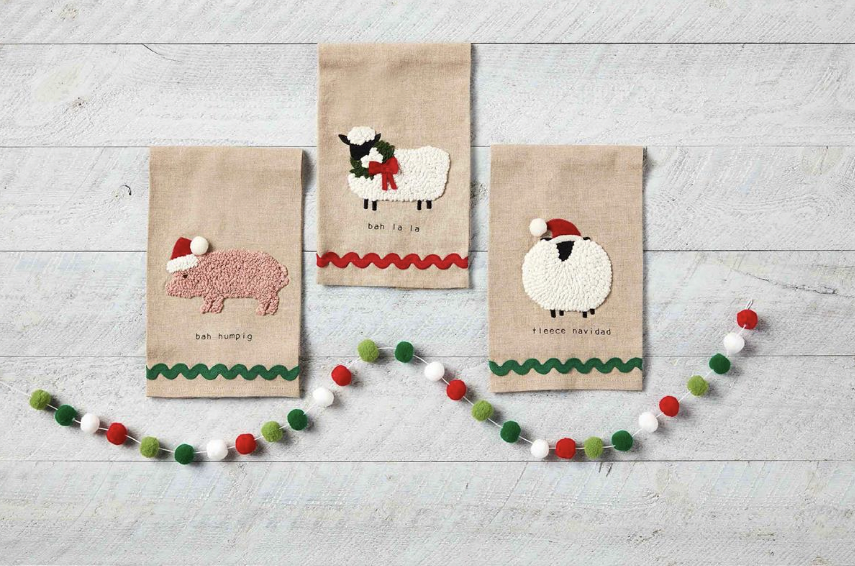 Embroidered chambray towel with mini pom and ric-rac detail.