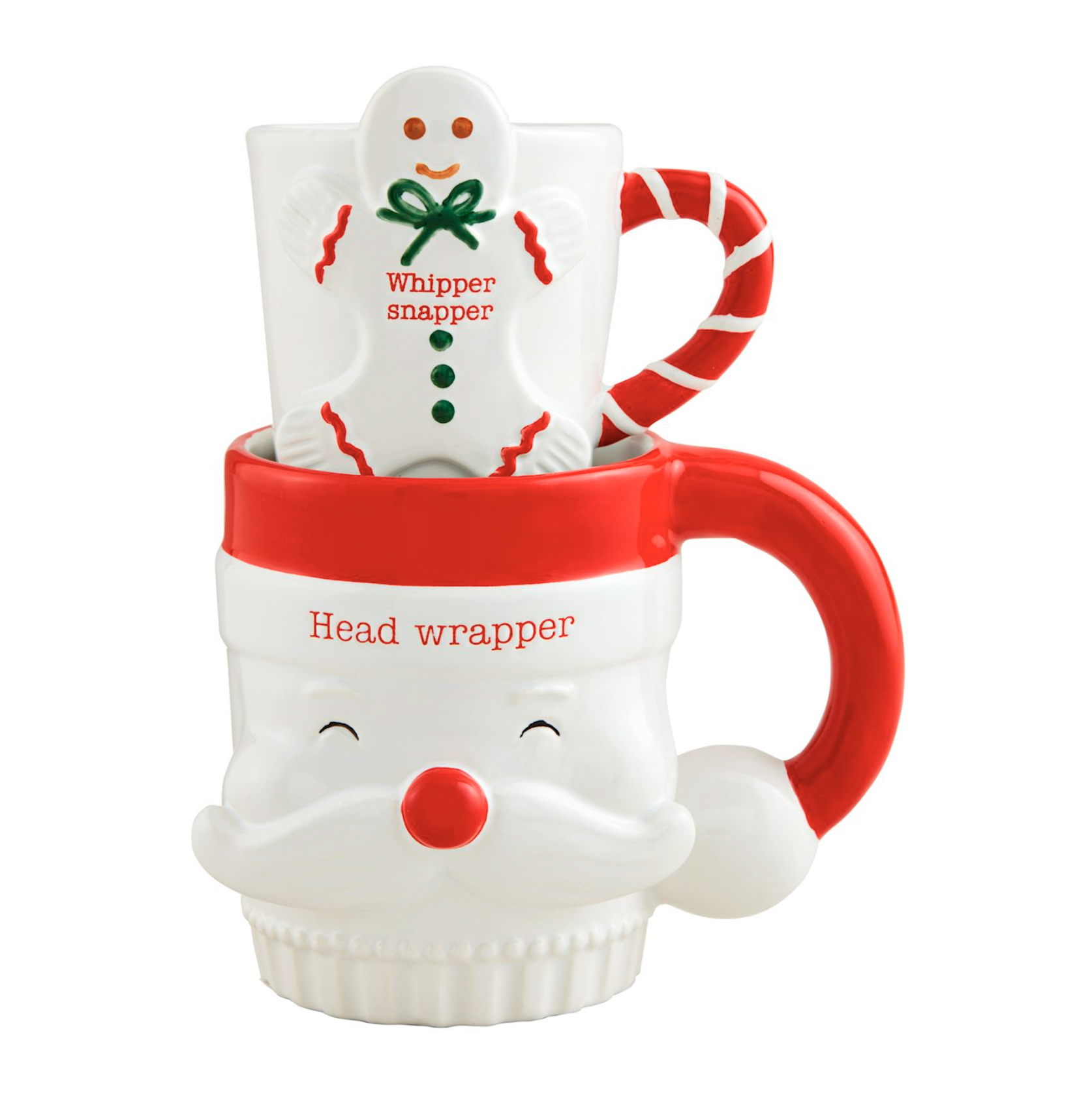2-piece set. "Head wrapper" large ceramic Santa mug comes with small "Whipper snapper" gingerbread man mug.
