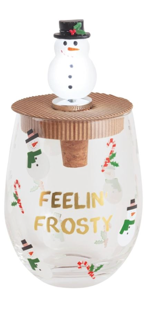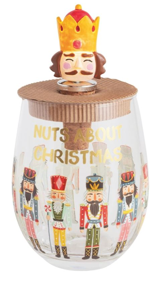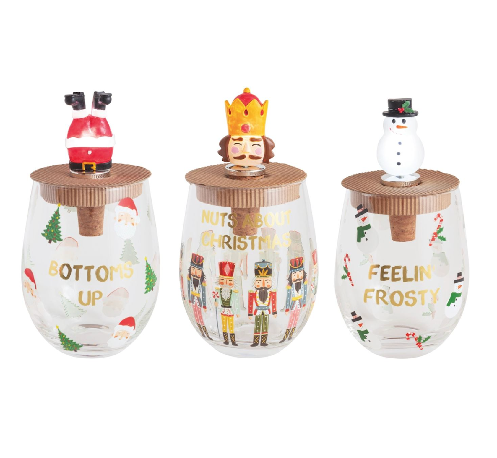 2-piece set. Foiled stemless wine glass. Comes with LED light-up resin figural bottle topper with cork stopper. Battery included.