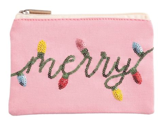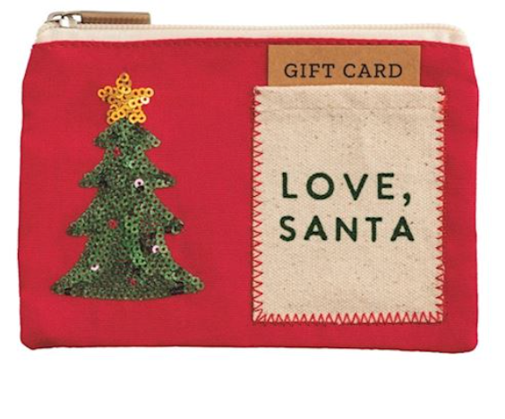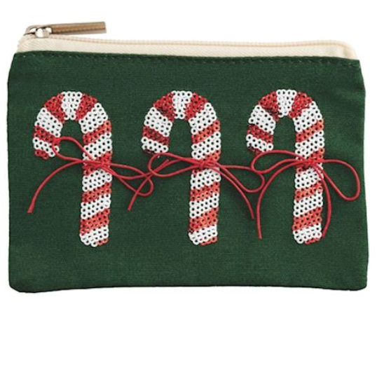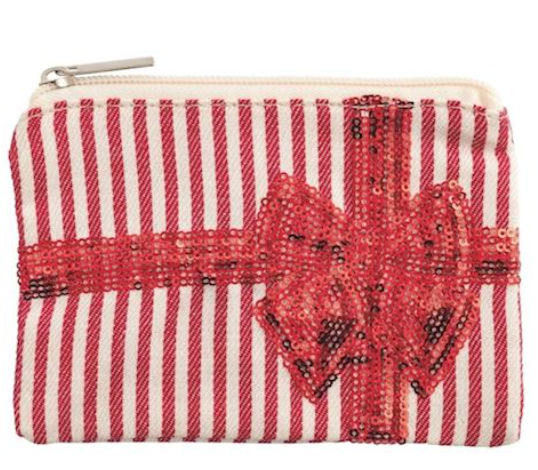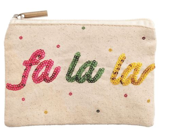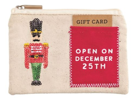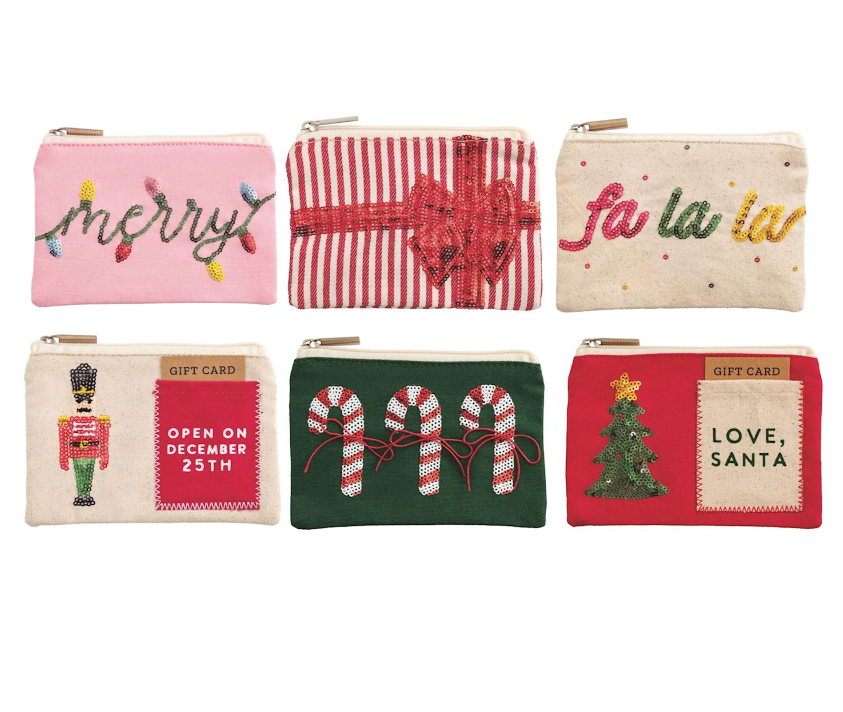 Canvas zipper pouch with sequin exterior. Nutcracker and tree styles include gift card pocket.