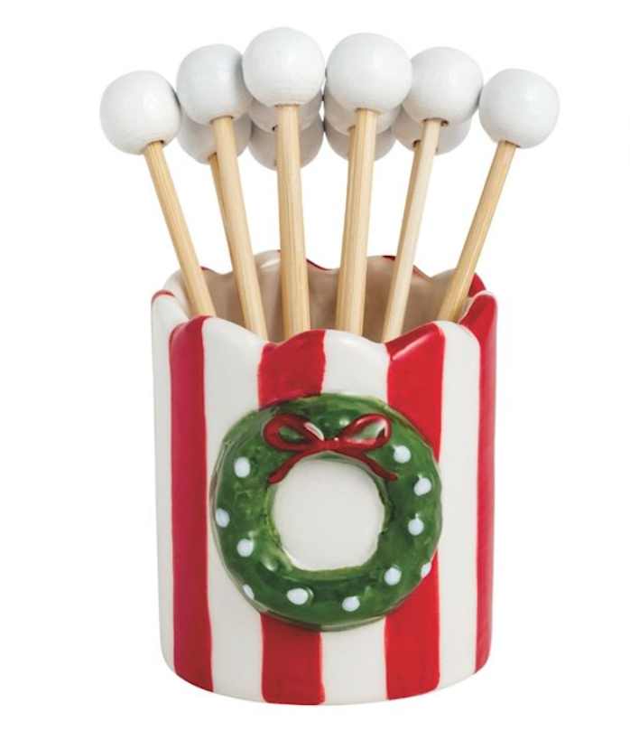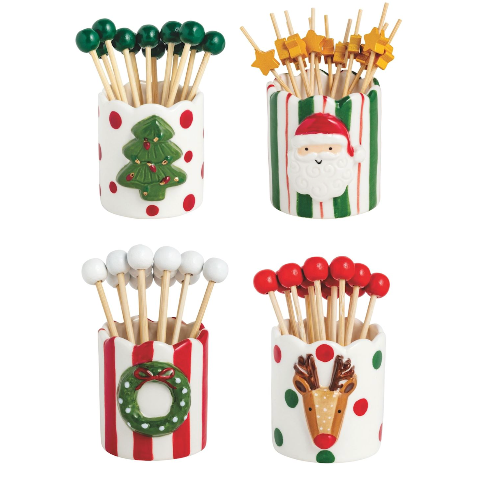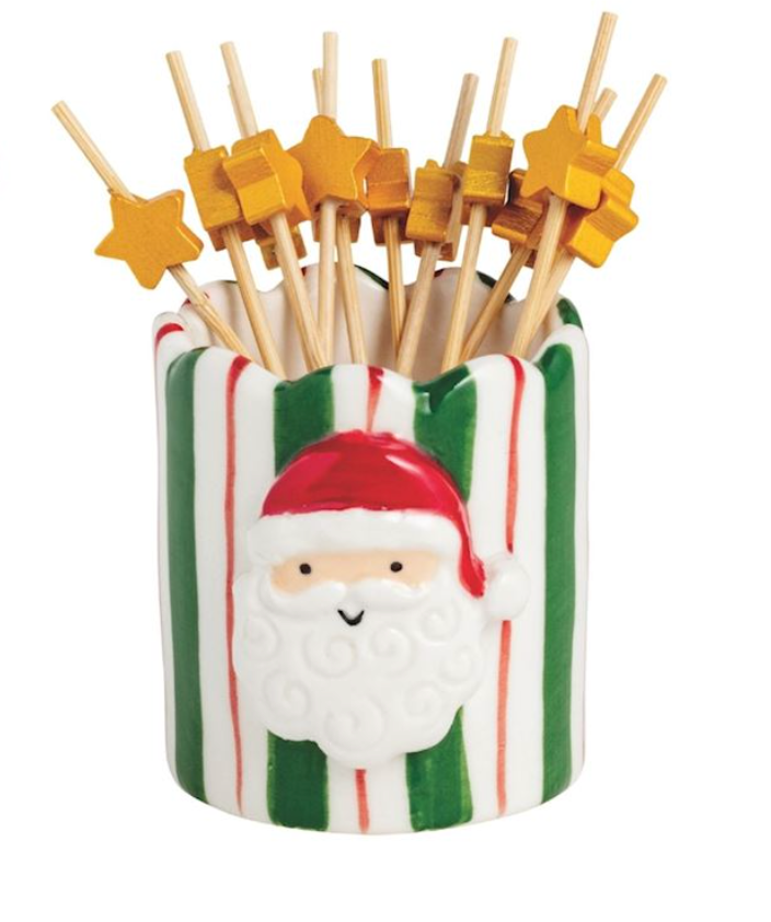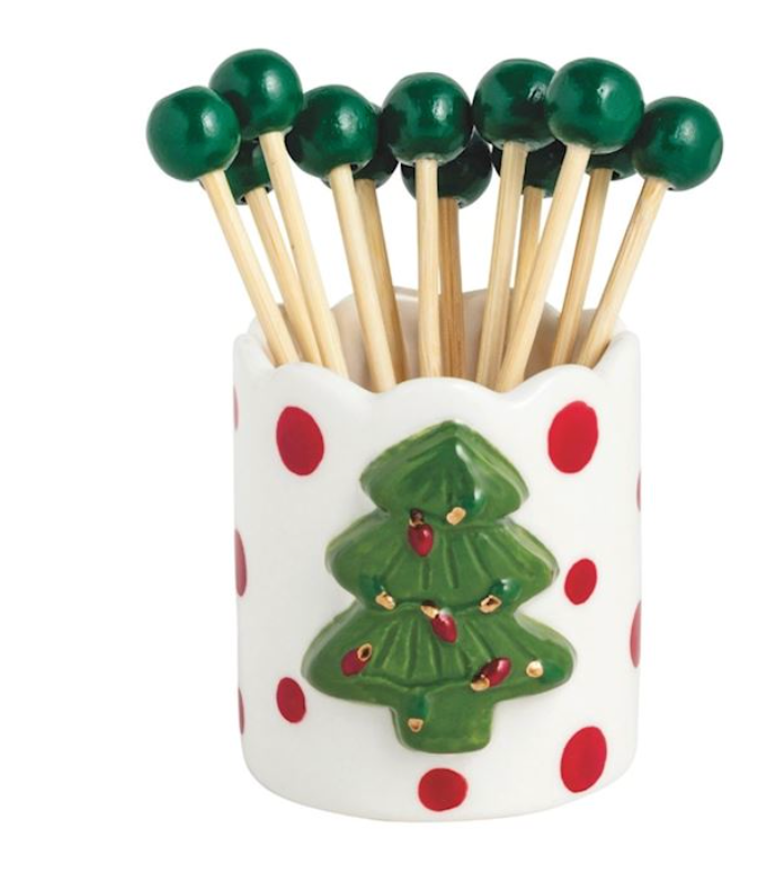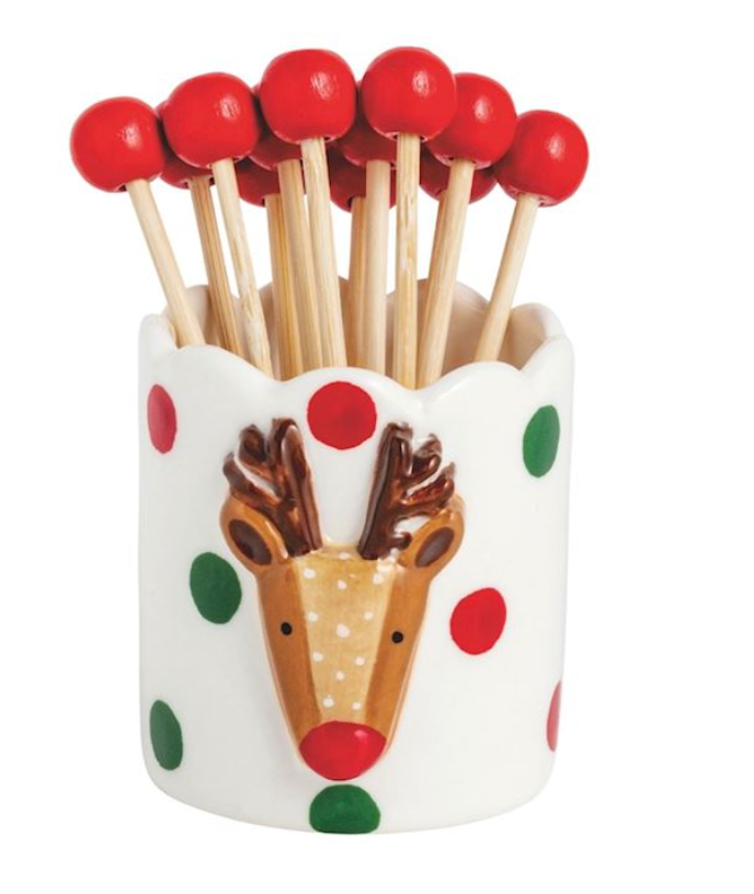 Hand-painted stoneware caddy comes with pack of wooden toothpicks with icon topper. Set comes wrapped in cello.