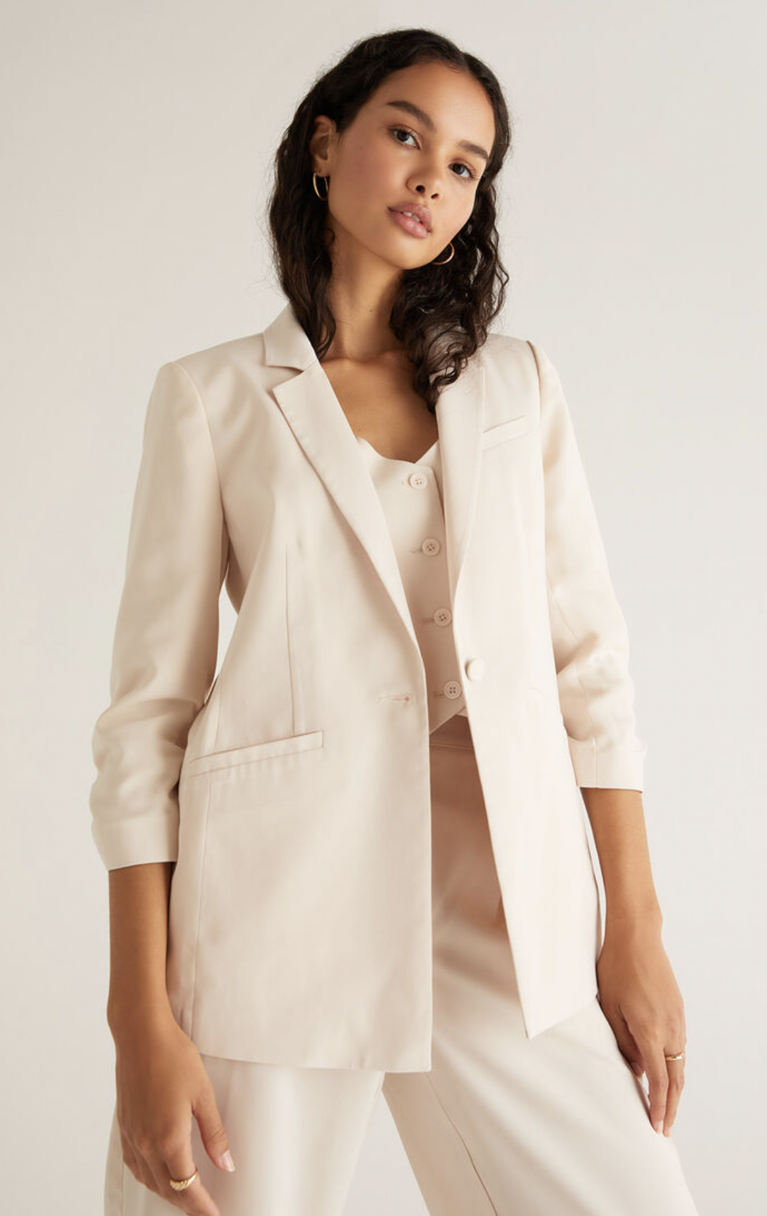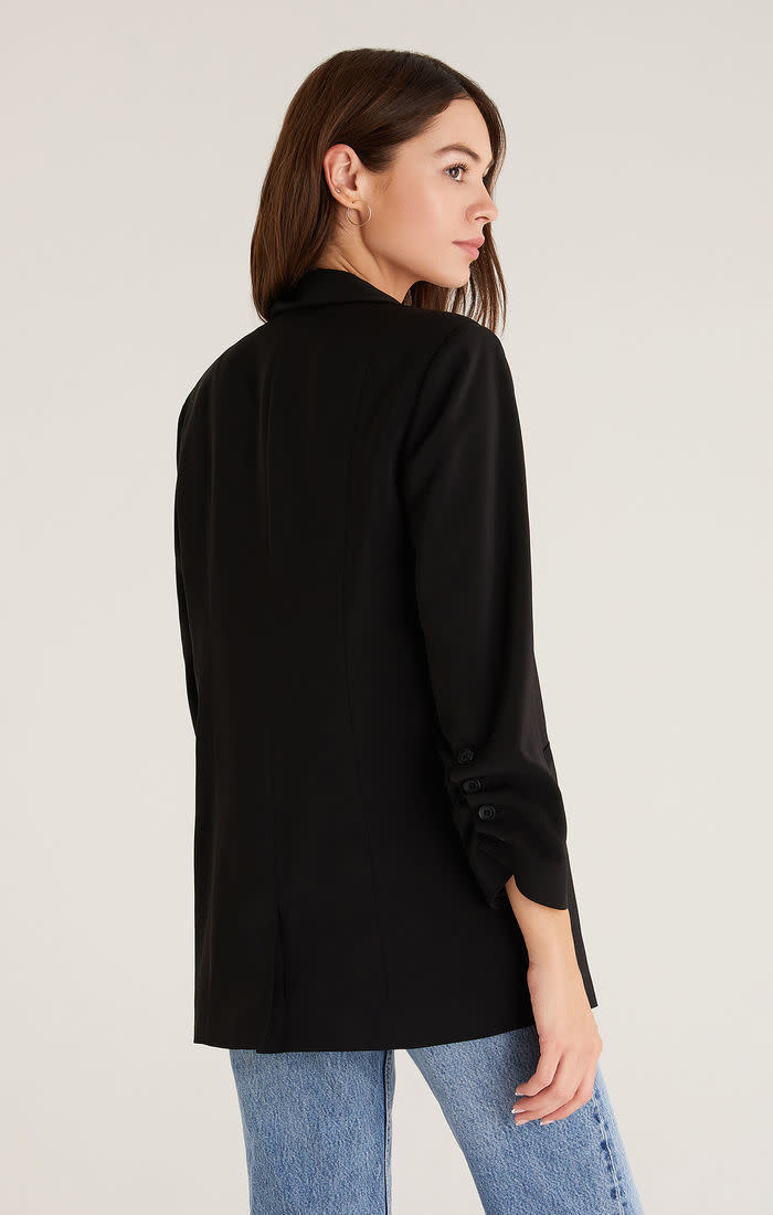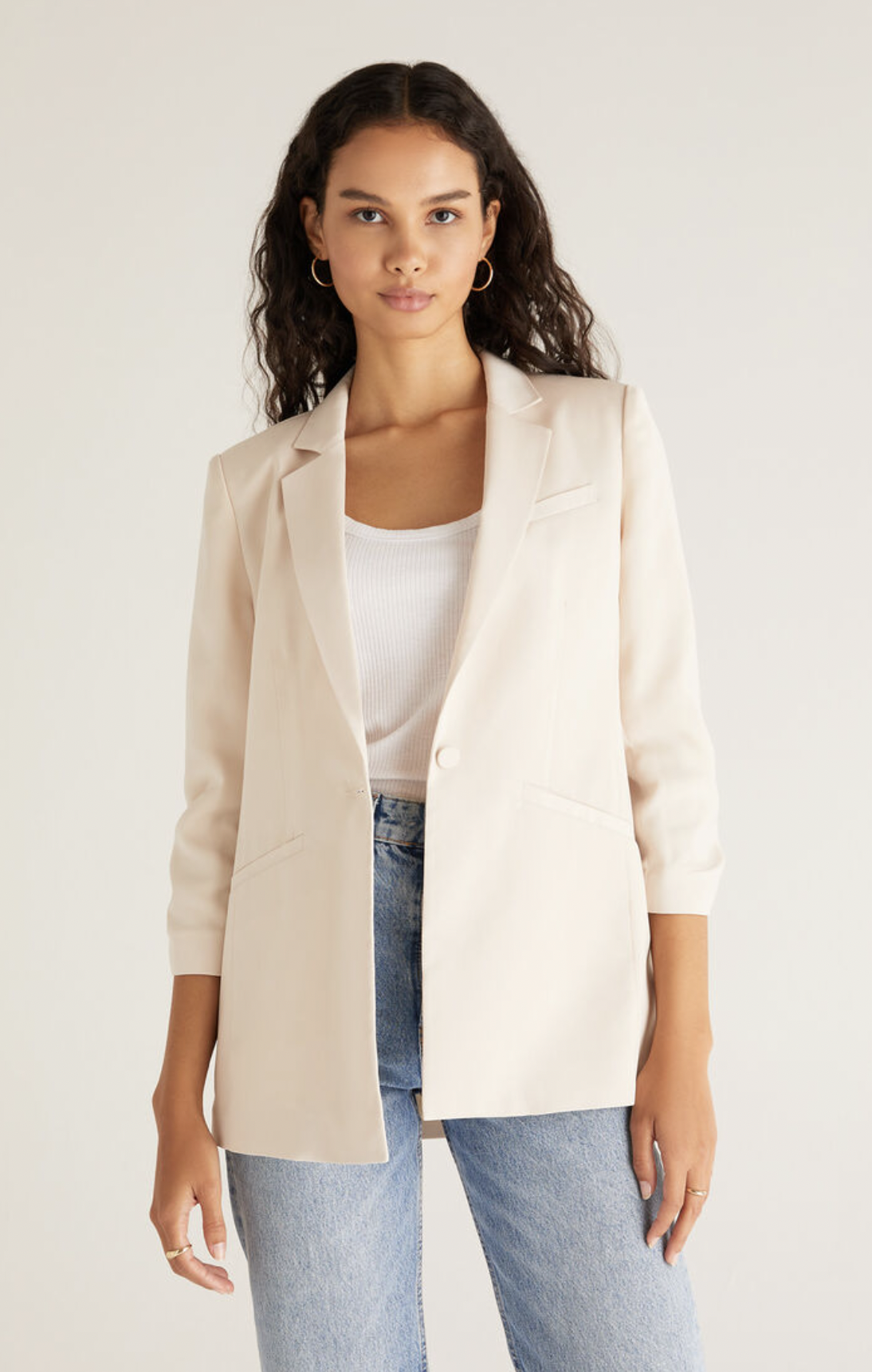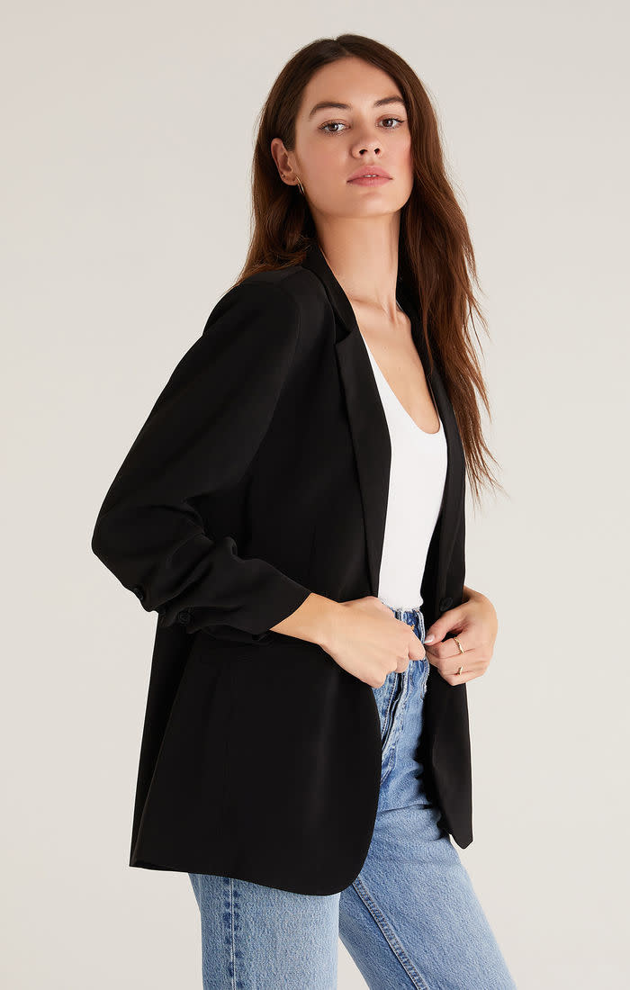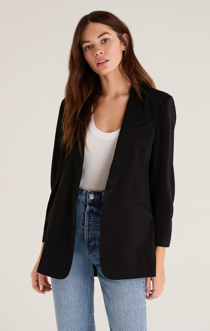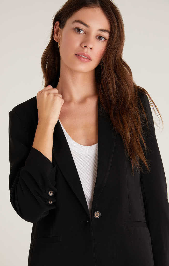 Introducing the Cinema Blazer. Be trend right and look sophisticated without compromising comfort. The ideal item for a cool and confident look. Designed in a matte twill fabric and ready to be paired with denim and a Z SUPPLY essential. Fabric Content: 100% Polyester