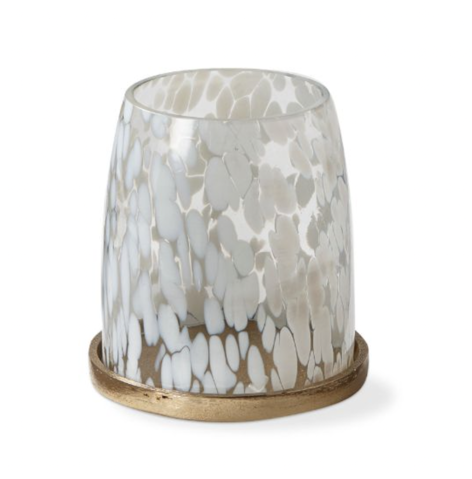 Each confetti hurricane is artisan blown and fully handcrafted using ancient glass techniques, with lively color sprinkled throughout. Features cast aluminum base with gold finish. It's the perfect eye-catching home decor! Slight variations in color are to be expected—individual glasses are one-of-a-kind, no two pieces will be exactly alike.