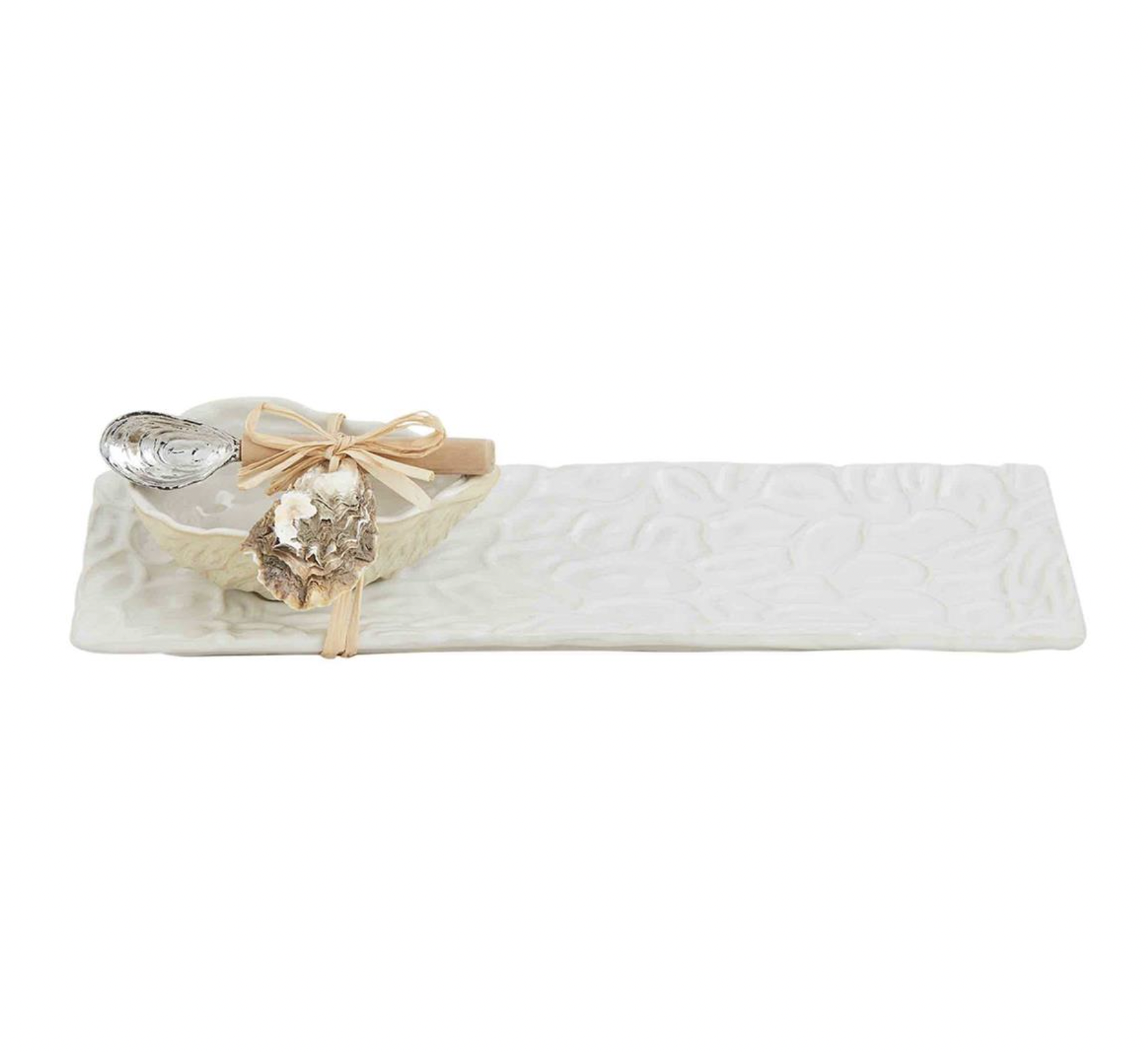 3-piece set. Oyster textured stoneware tray. Comes with dip cup and driftwood and metal shell spoon.