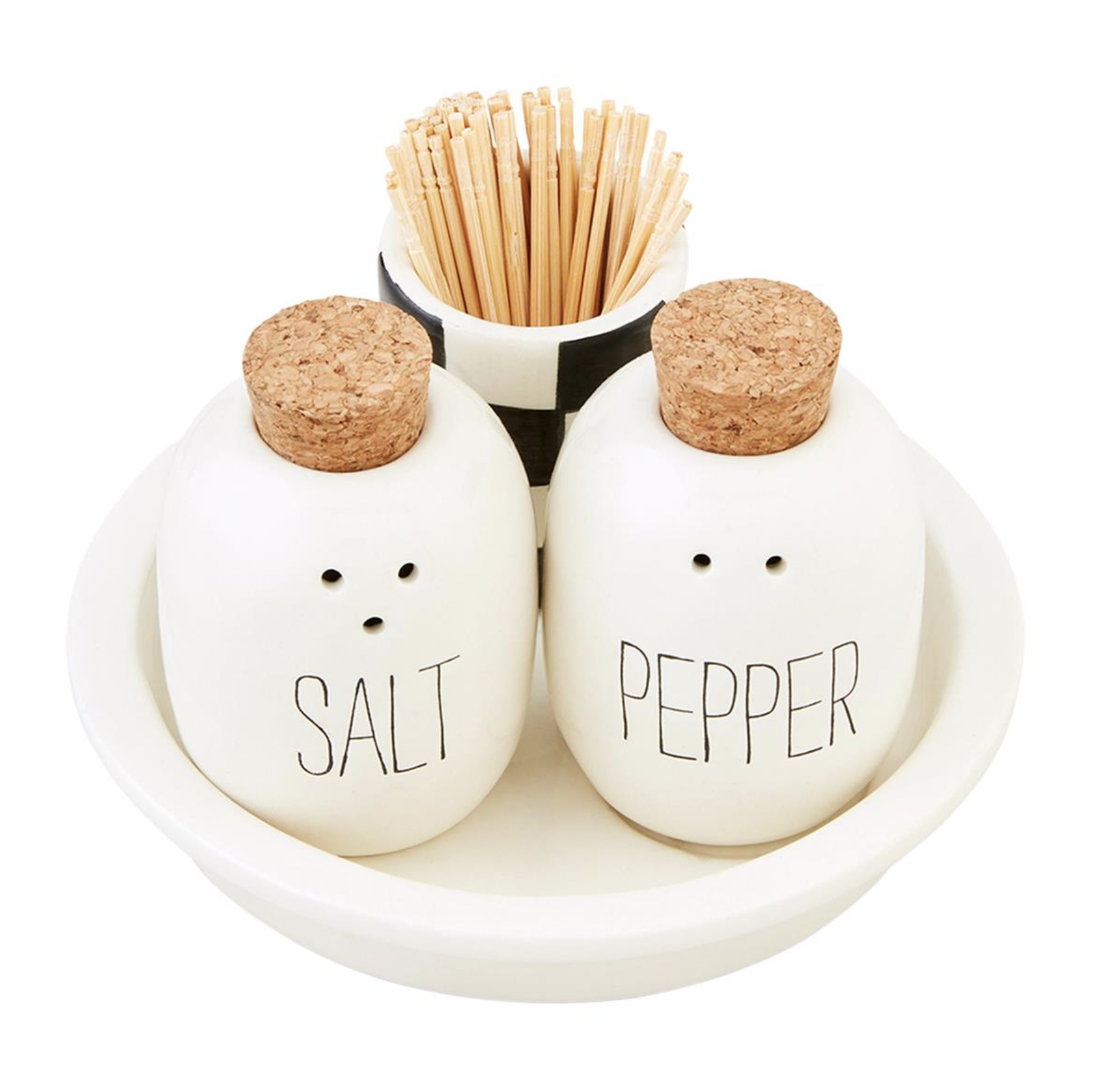 CHECKERED SALT & PEPPER TOOTHPICK CADDY SET