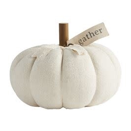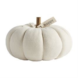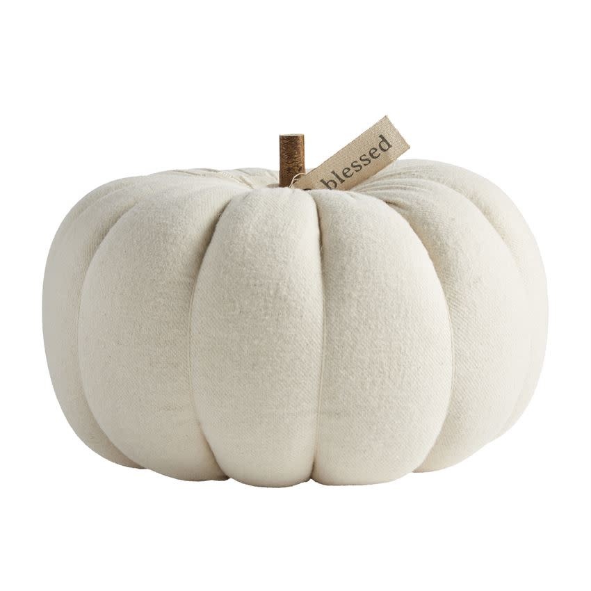 Stuffed cotton pumpkin with wood stem and canvas tag.