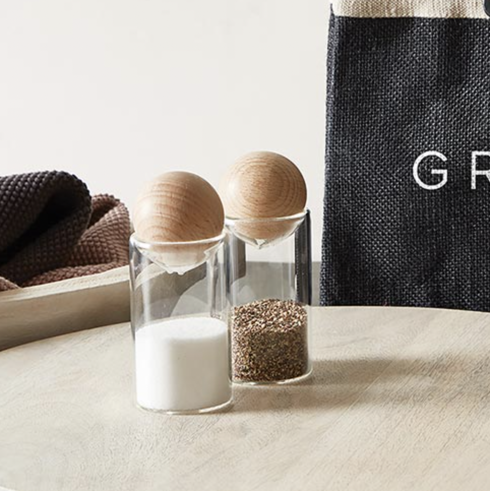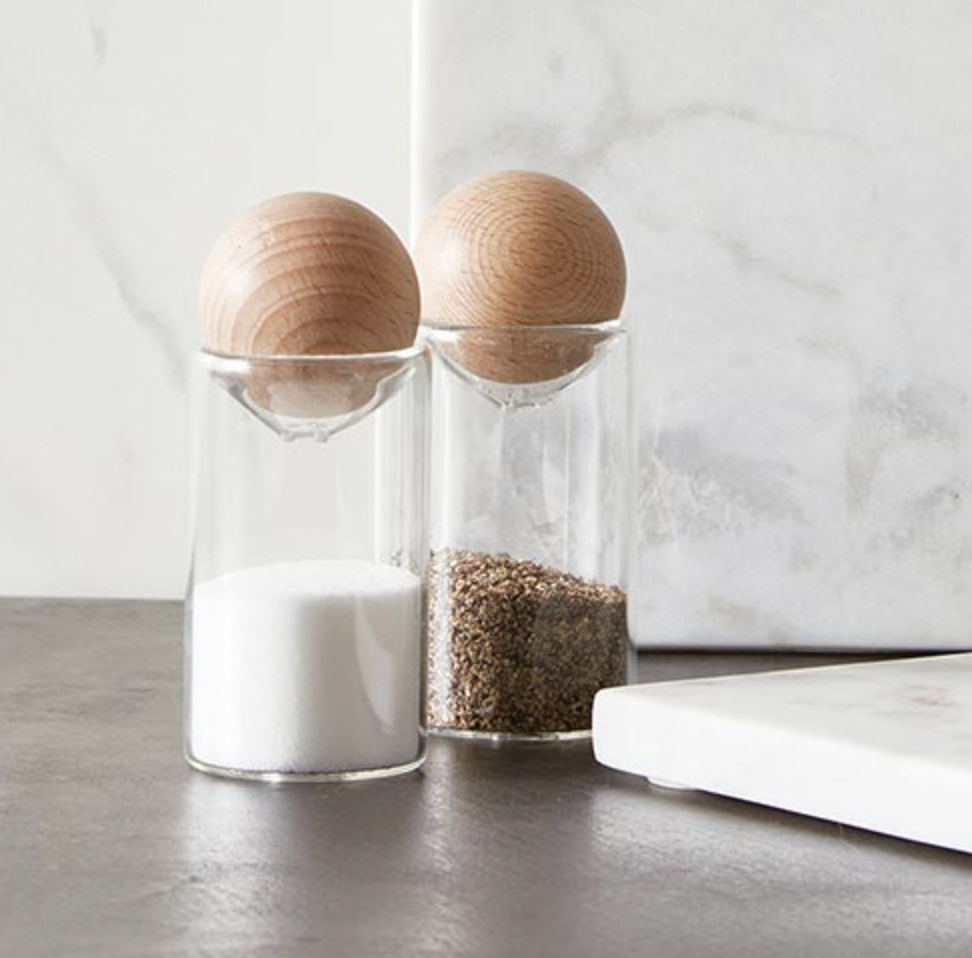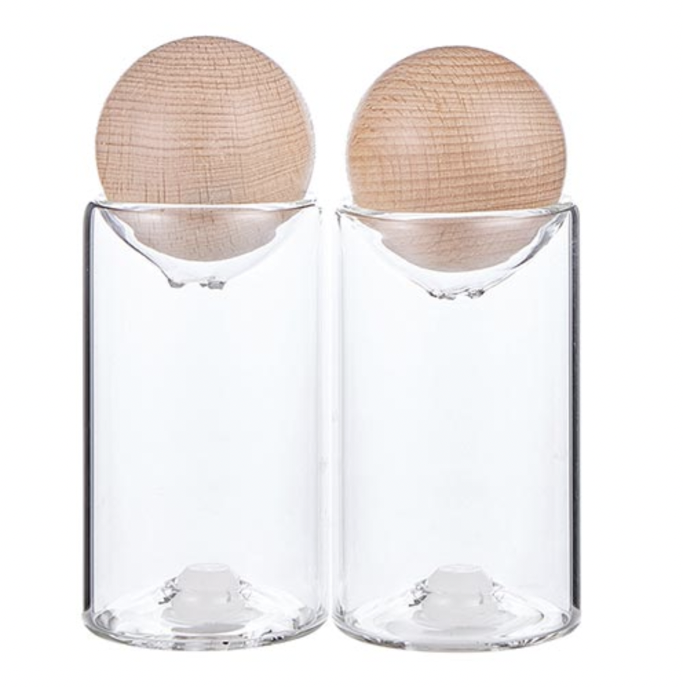 Not your ordinary salt and pepper set. This set contributes to both function and design so that dinner guests can sprinkle their desired amount on the food with ease. Fill from the base, with wooden ball on top.