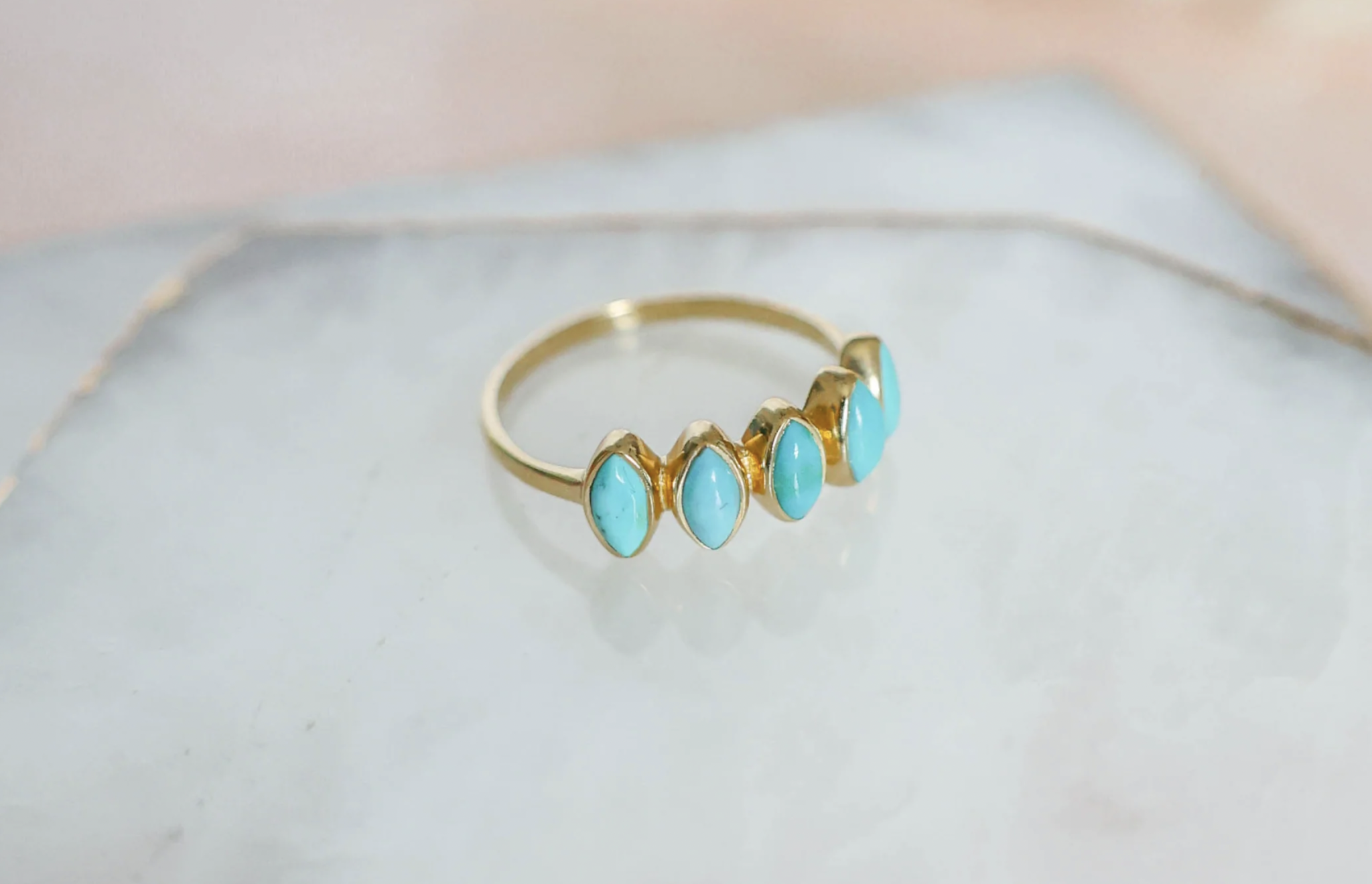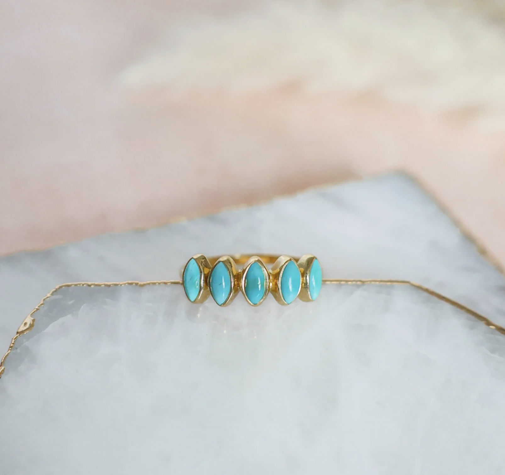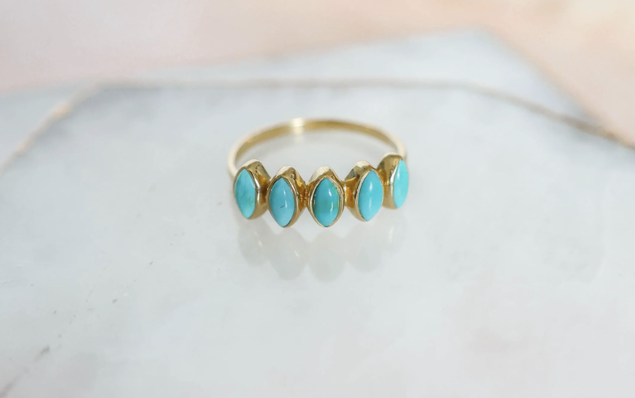This five stone marquise turquoise ring is the perfect day to night transition piece. Comfortable and dainty enough to wear anytime, but also unique and edgy for a night out!
