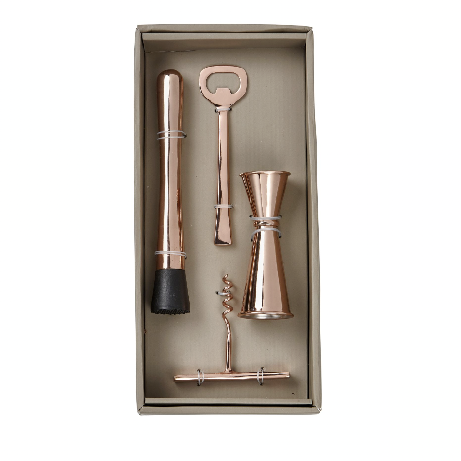 make a style statement with essential bar accessories. this stainless steel barware set comes in handy for your bar cart, home bar, restaurant, and catered events! includes a corkscrew opener, bottle opener, jigger, and muddler. copper plated. perfect for gifting!