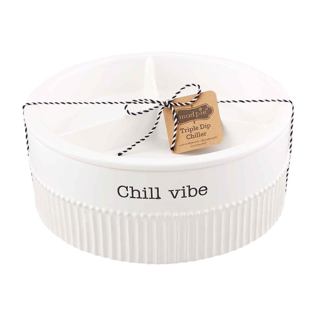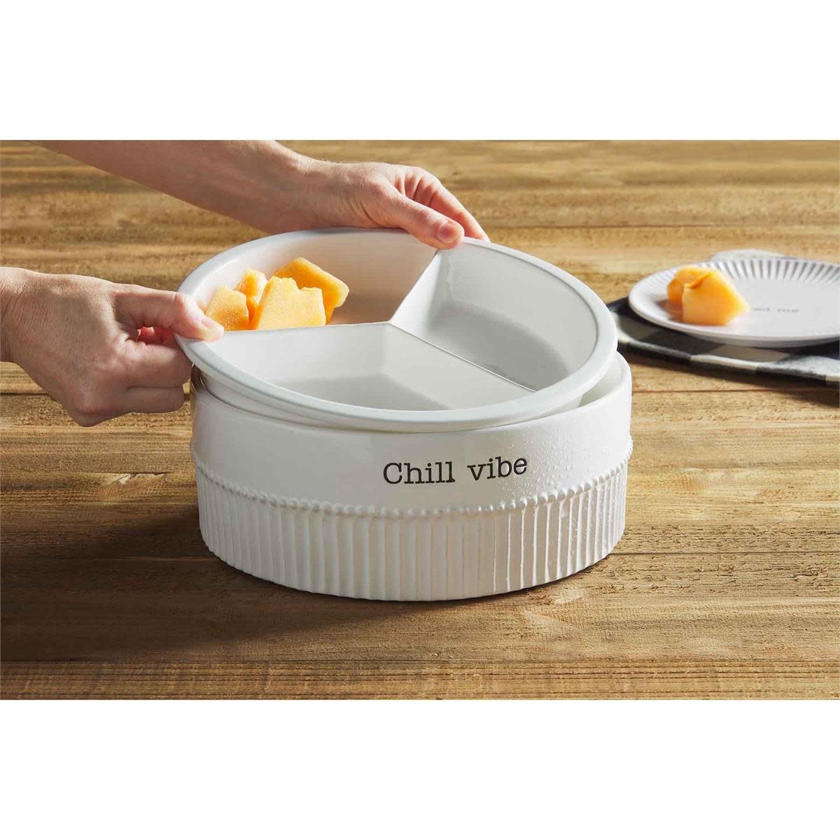 2-piece set. Removable ceramic triple dip dish nests inside beaded ceramic chiller to keep cool.