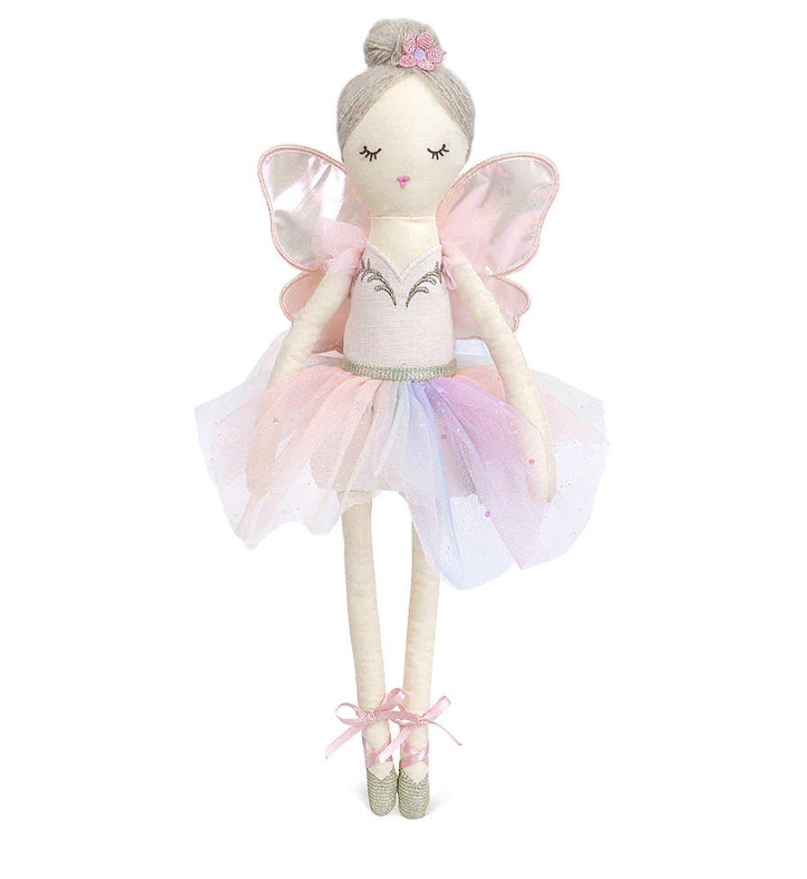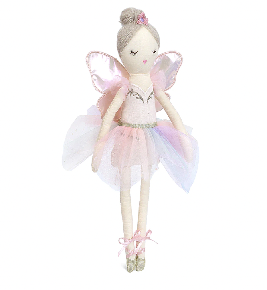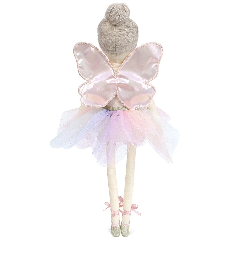 Yara Butterfly Ballerina Doll steals the spotlight. This exquisitely detailed soft ballerina doll is decked out for the performance of a lifetime in a frothy ombr' tutu, lace-up slippers and iridescent butterfly wings. A beautifully embroidered face and soft, squeezable body make this one-of-a-kind butterfly ballerina doll a constant companion. Mon Ami????s elegant butterfly doll twirls and flutters her way into any young dancer's heart, sparking hours of imaginative play.