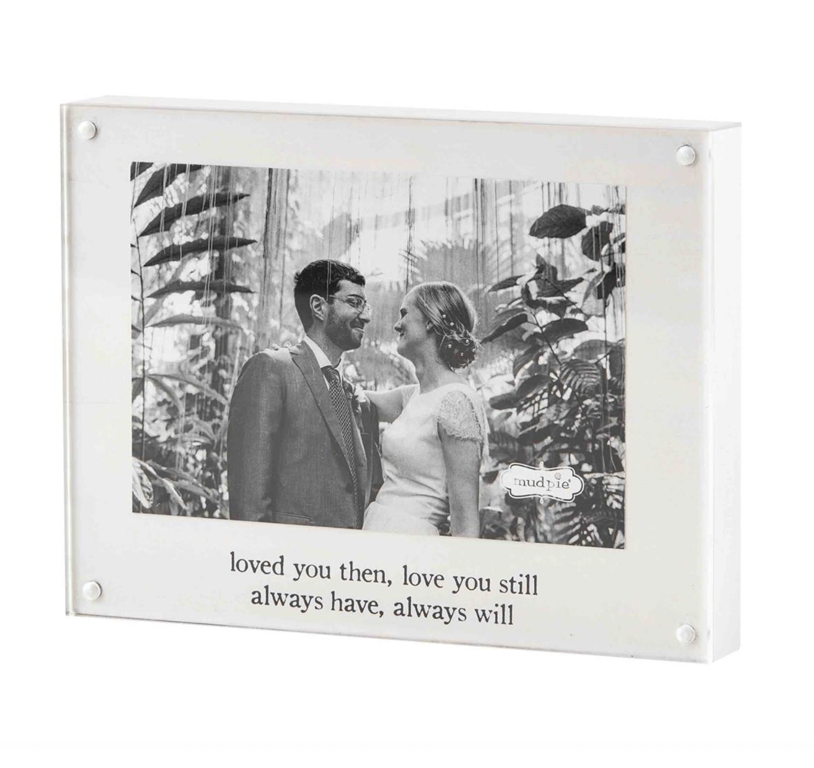 Hand-painted magnetic wood block frame features acrylic magnet surface to hold 4" x 6" photo in place.