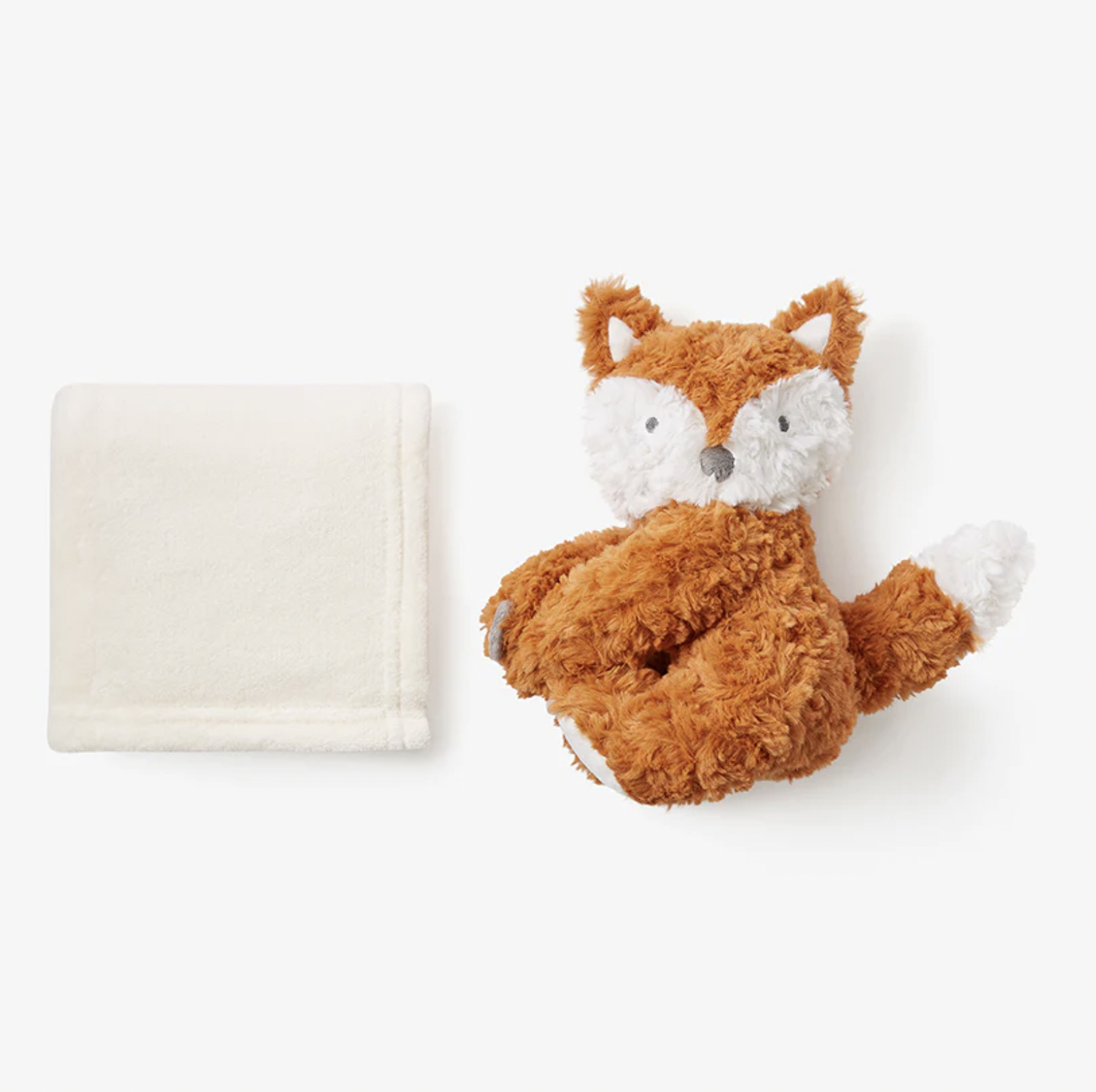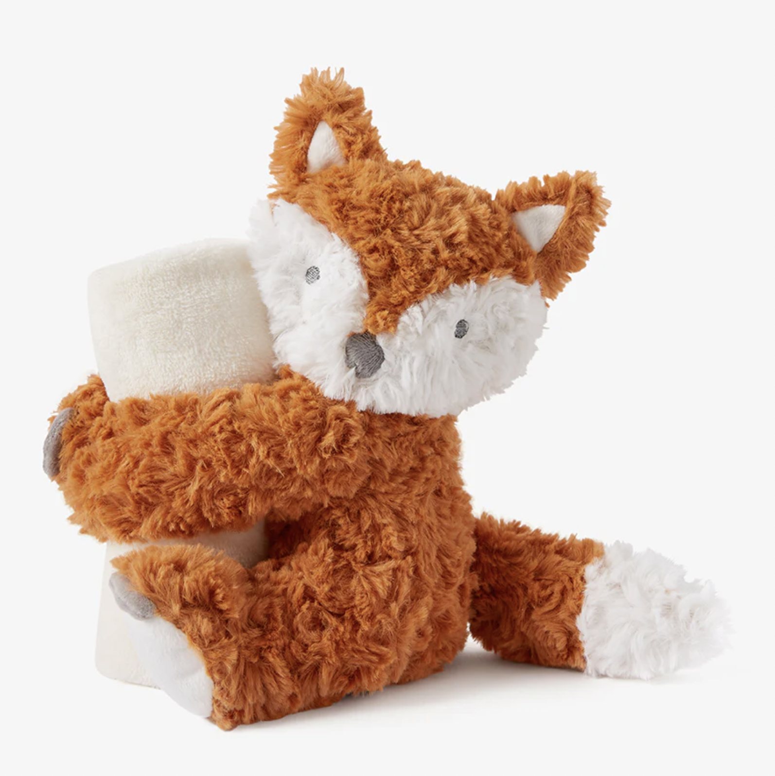 - 8" plush toy holding a 17" x 17" fleece baby blanket