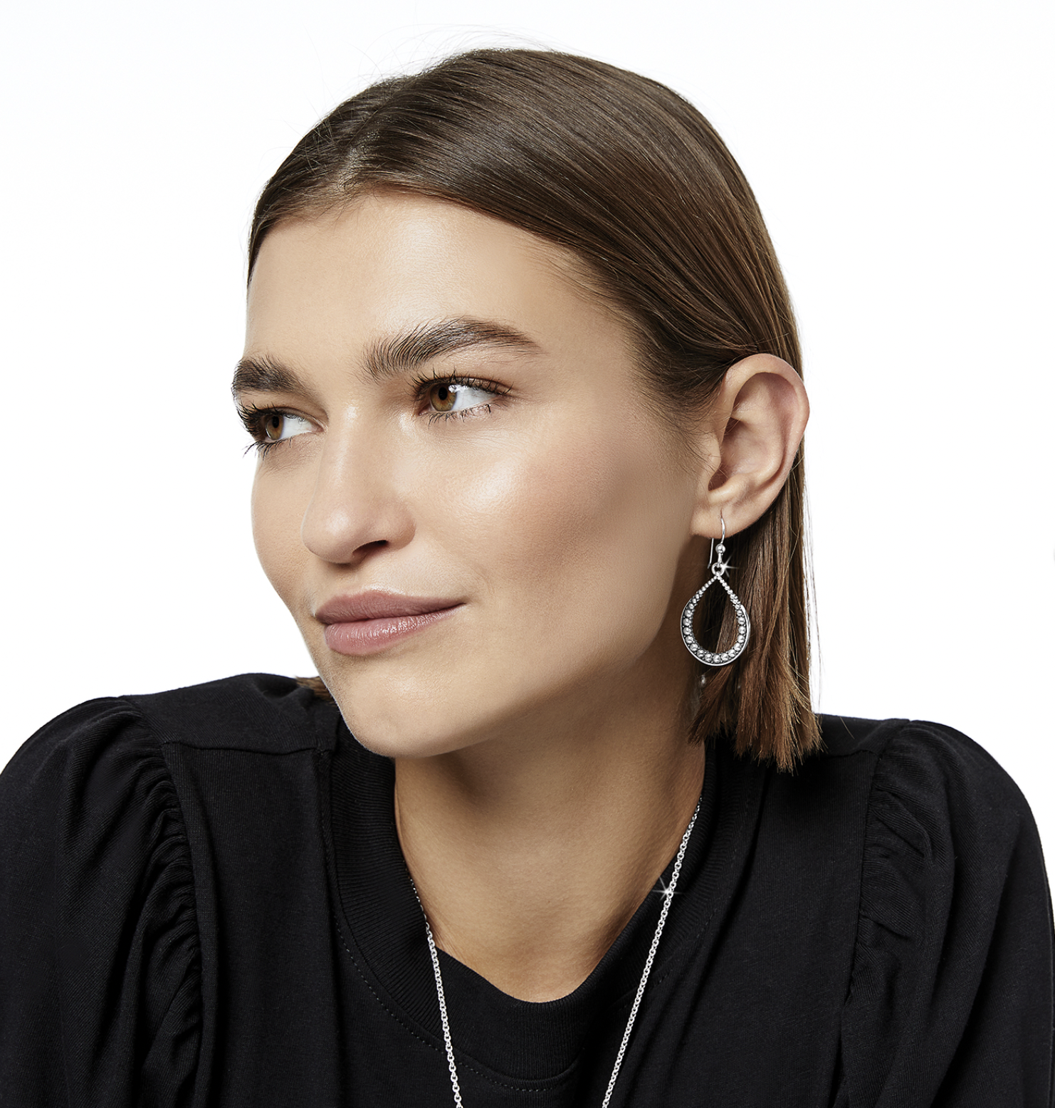 Whenever you want to exude urban elegance, reach for these silver studded bold teardrop-shaped French Wire earrings which channel the limelight of Hollywood and New York City in the 1980s and early 90s – a truly modern classic with the look of silversmithing.