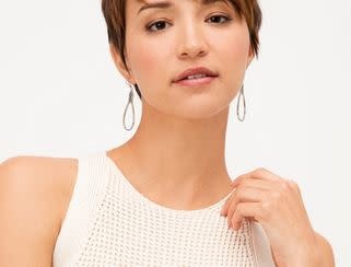 Recalling Celtic motifs, the interlocking knot in this collection historically signifies love and life. A classic teardrop hoop dangles in neverending style. Lightweight and comfortable!