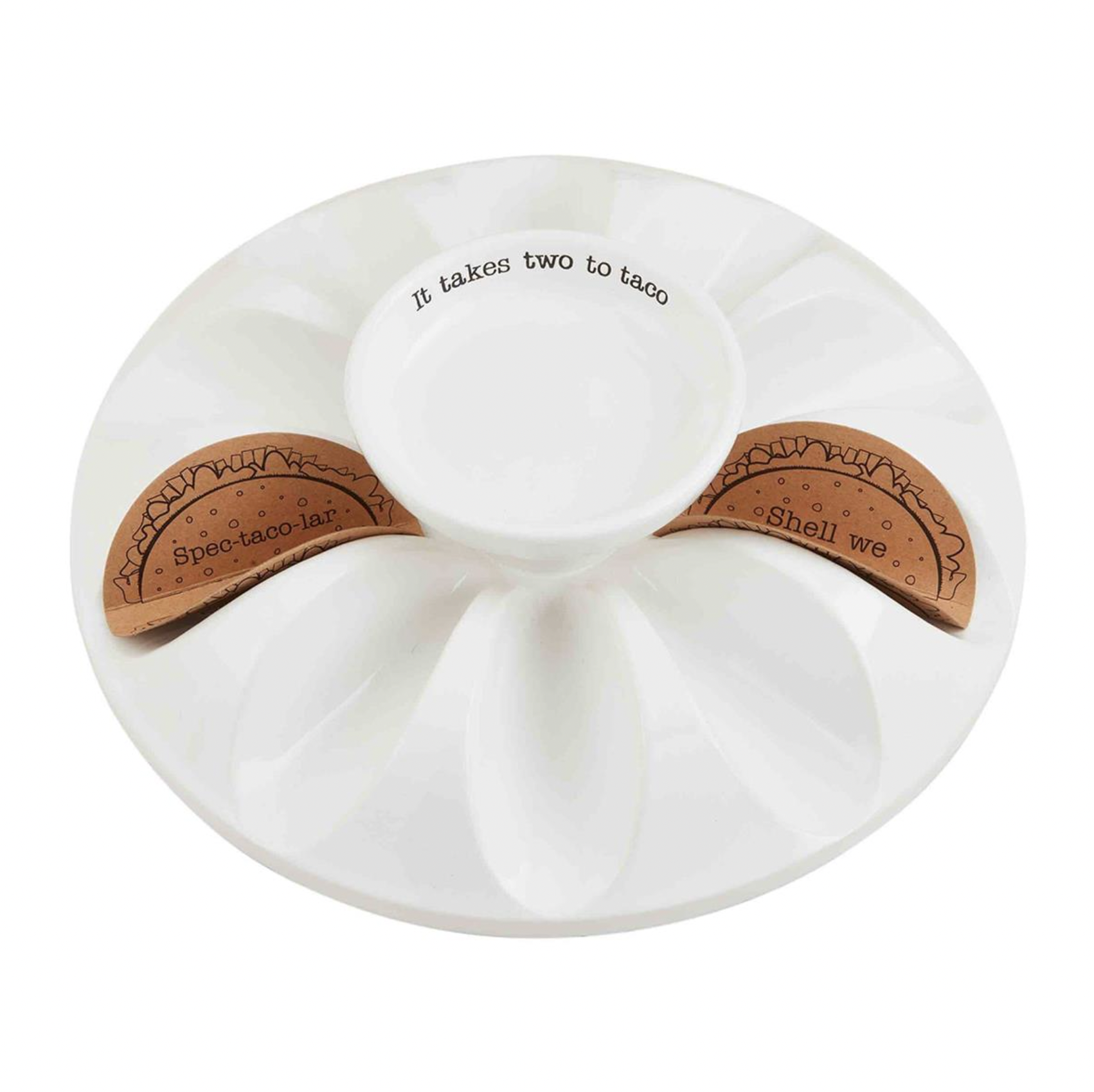 Ceramic platter features dimensional grooves to hold taco shells upright and center dip bowl.