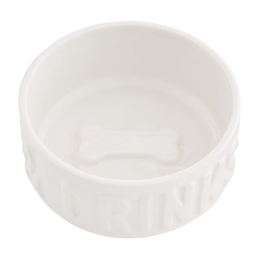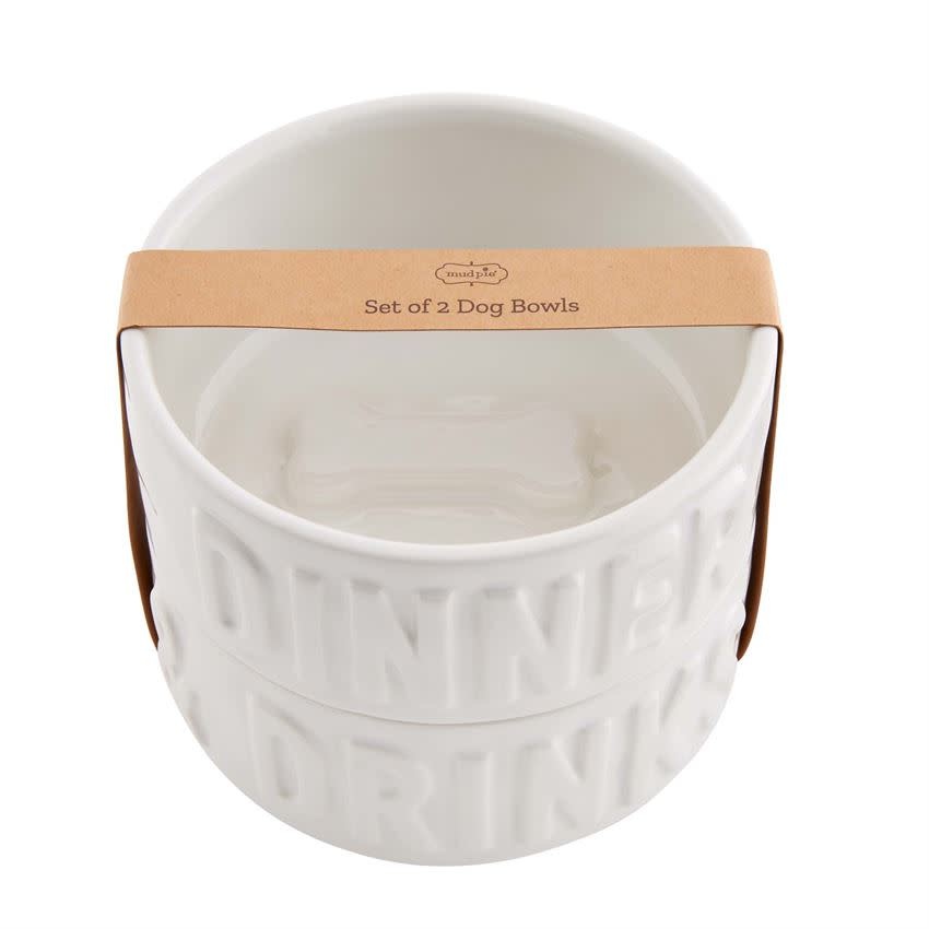 Set of two ceramic dog bowls with raised in-mold exterior sentiment and interior bones.