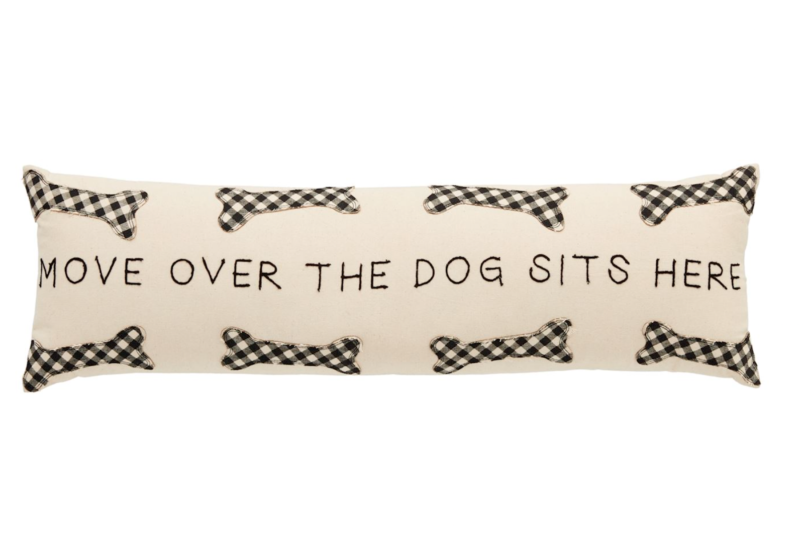 Canvas long pillow features buffalo check appliques and chunky embroidery. Zipper closure