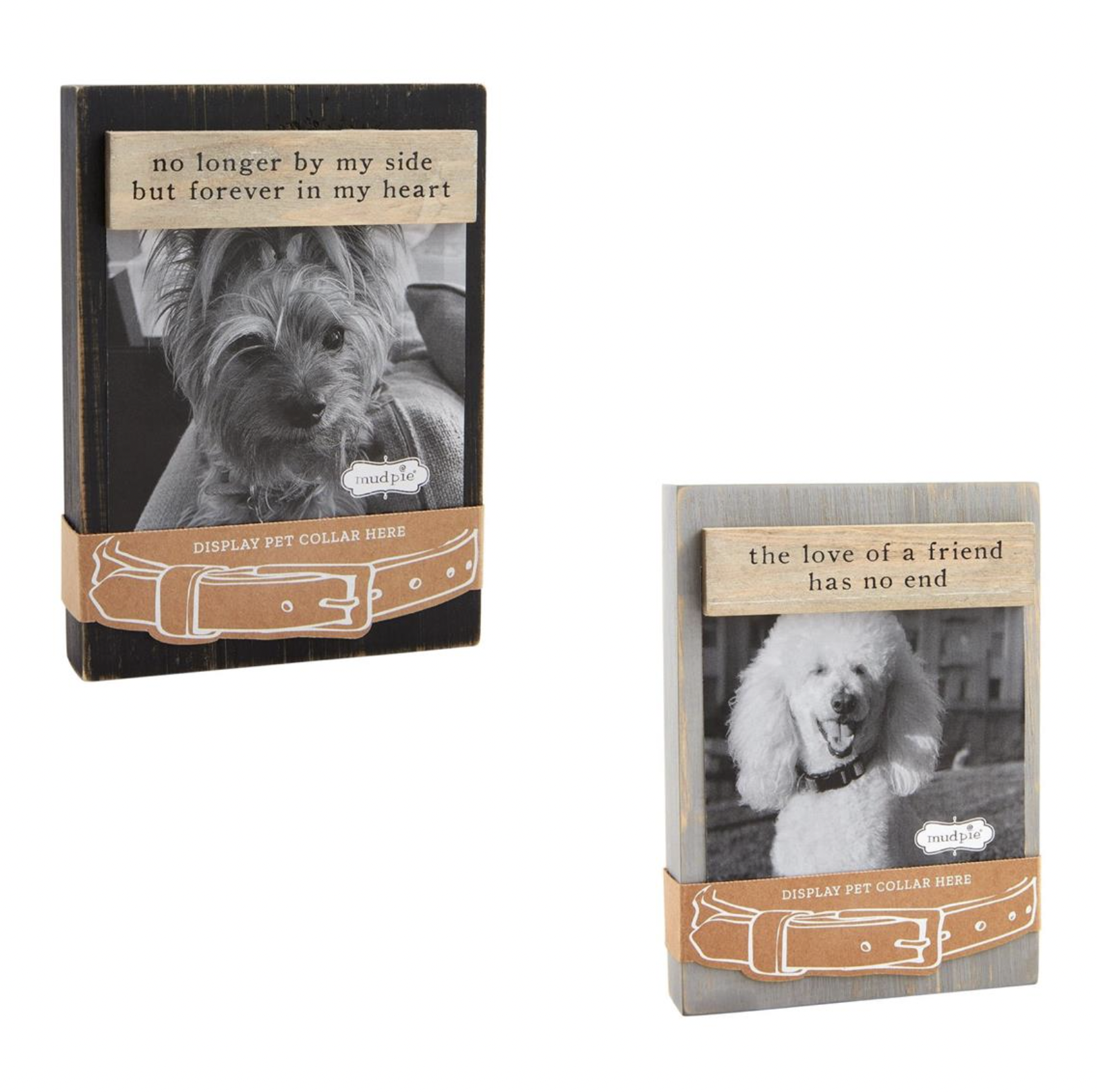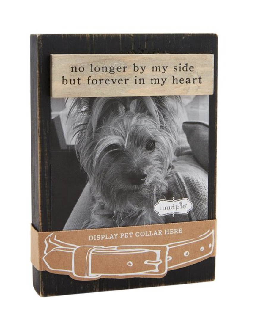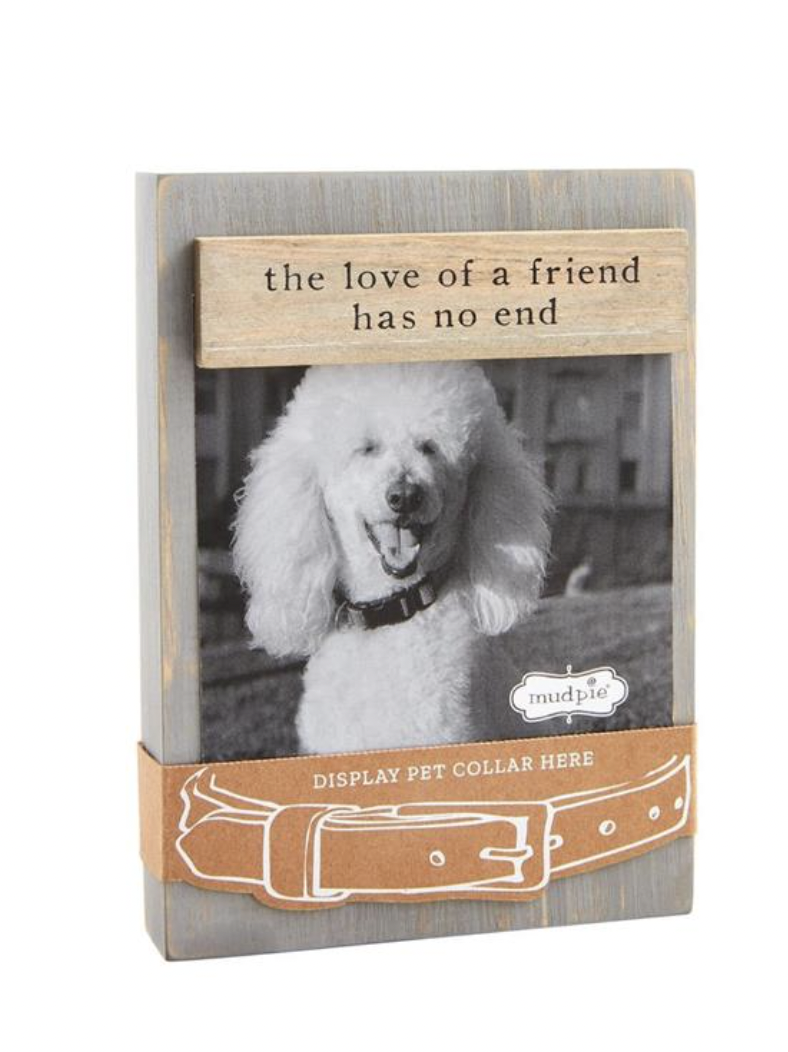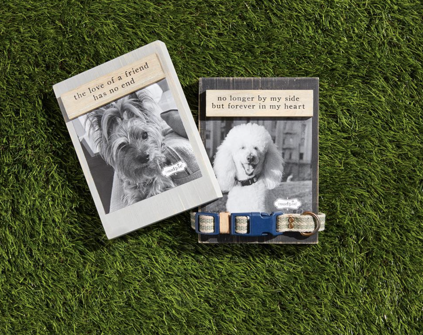 Magnetic wooden block frame. Included magnet holds 4" x 4" photo in place. Kraft dog collar wrap suggests how to secure dog's collar around frame.