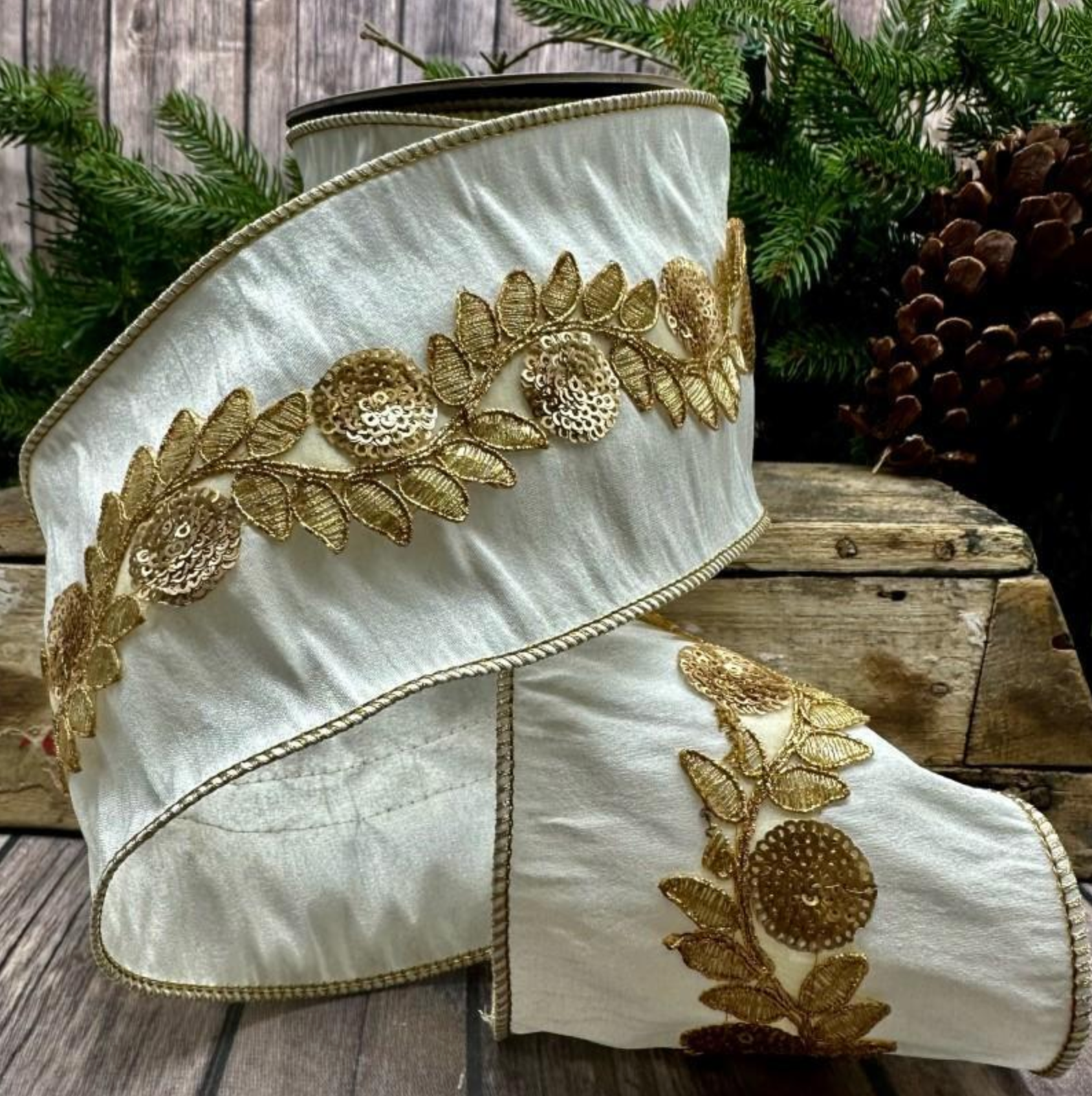 DUPIONI GOLD SEQUIN VINE RIBBON-IVORY 4'X5 YDS