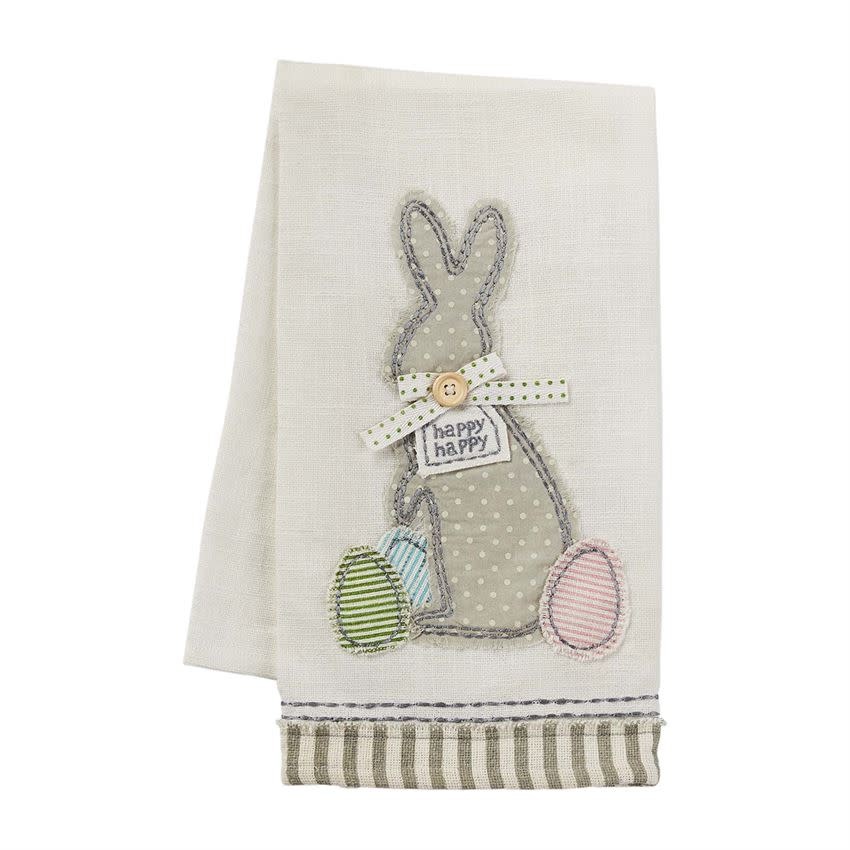 Cotton slub hand towel features contrast panel hem, embroidered sentiment and cotton and grainsack appliques with twill bow and wood button details.