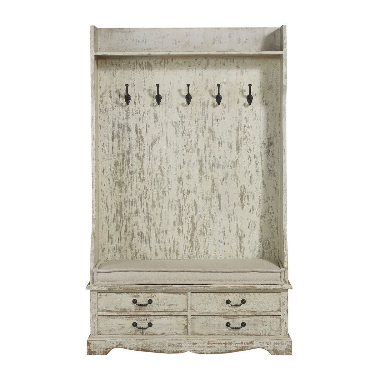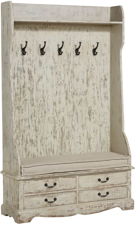 What a wonderful solution to entryway clutter! Four drawers are perfect for storing shoes and dog leashes, and helpful antique iron hooks hang coats and back packs. A comfortable boxed cushion with a puffed flange welt and an extra upper shelf makes this piece a must have for today's busy families. The reclaimed pine frame is softly highlighted with a distressed dove finish.