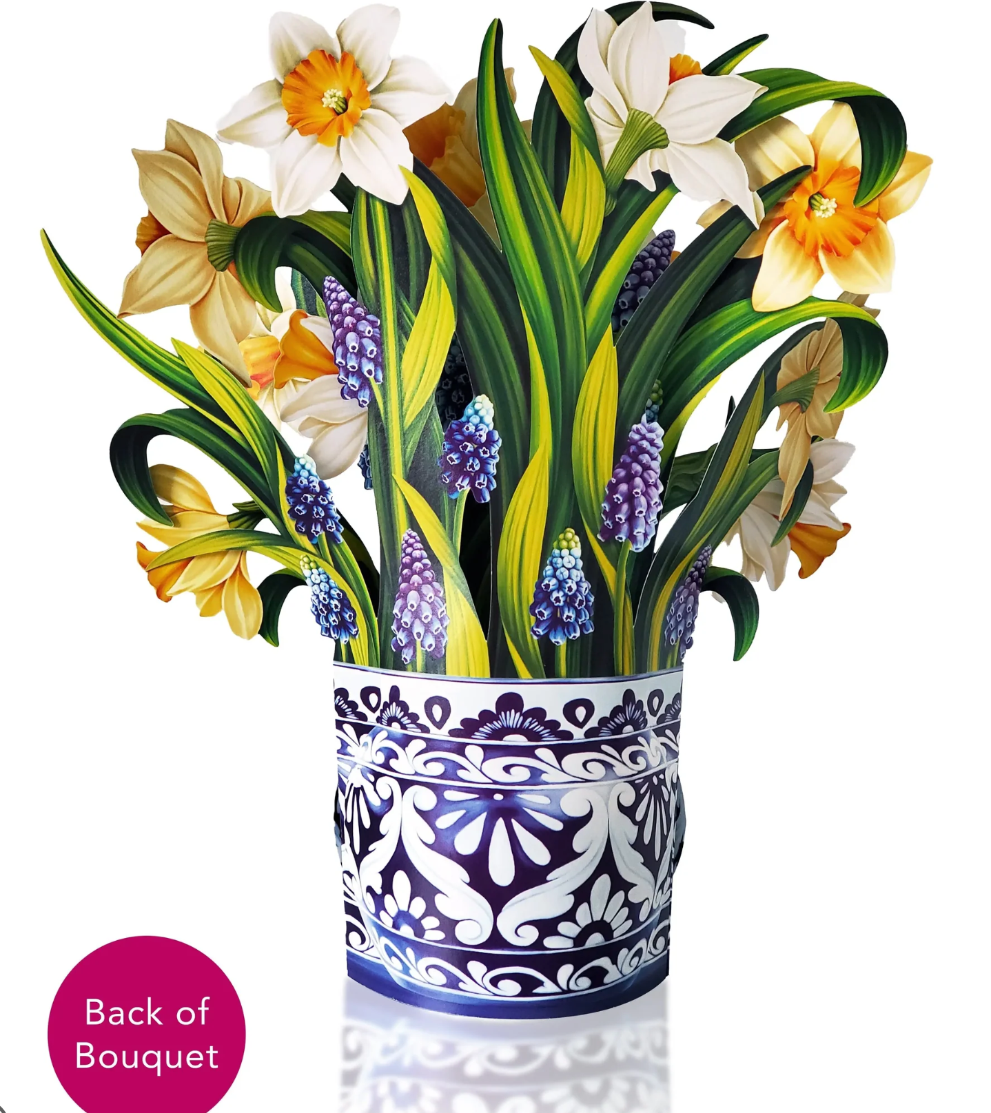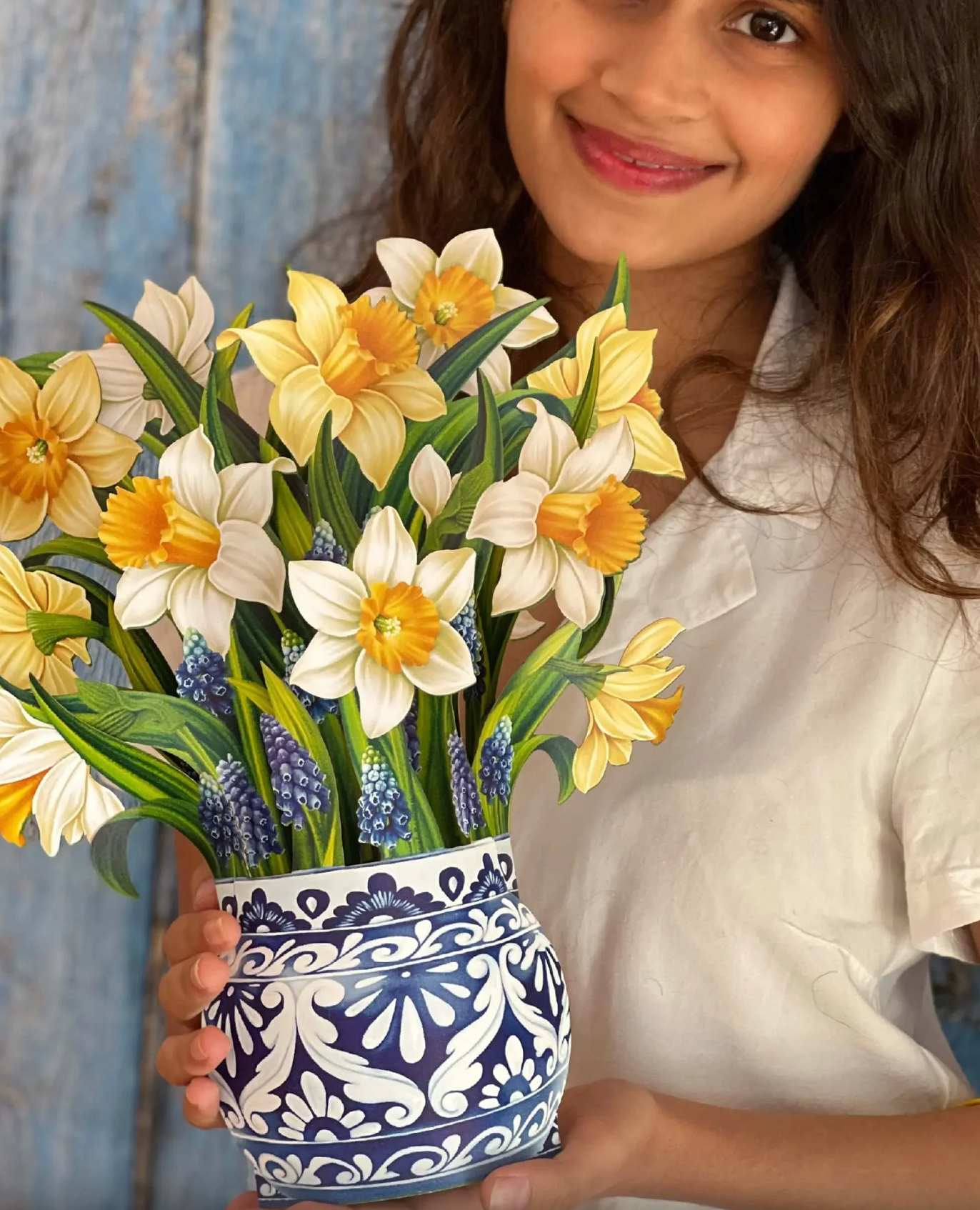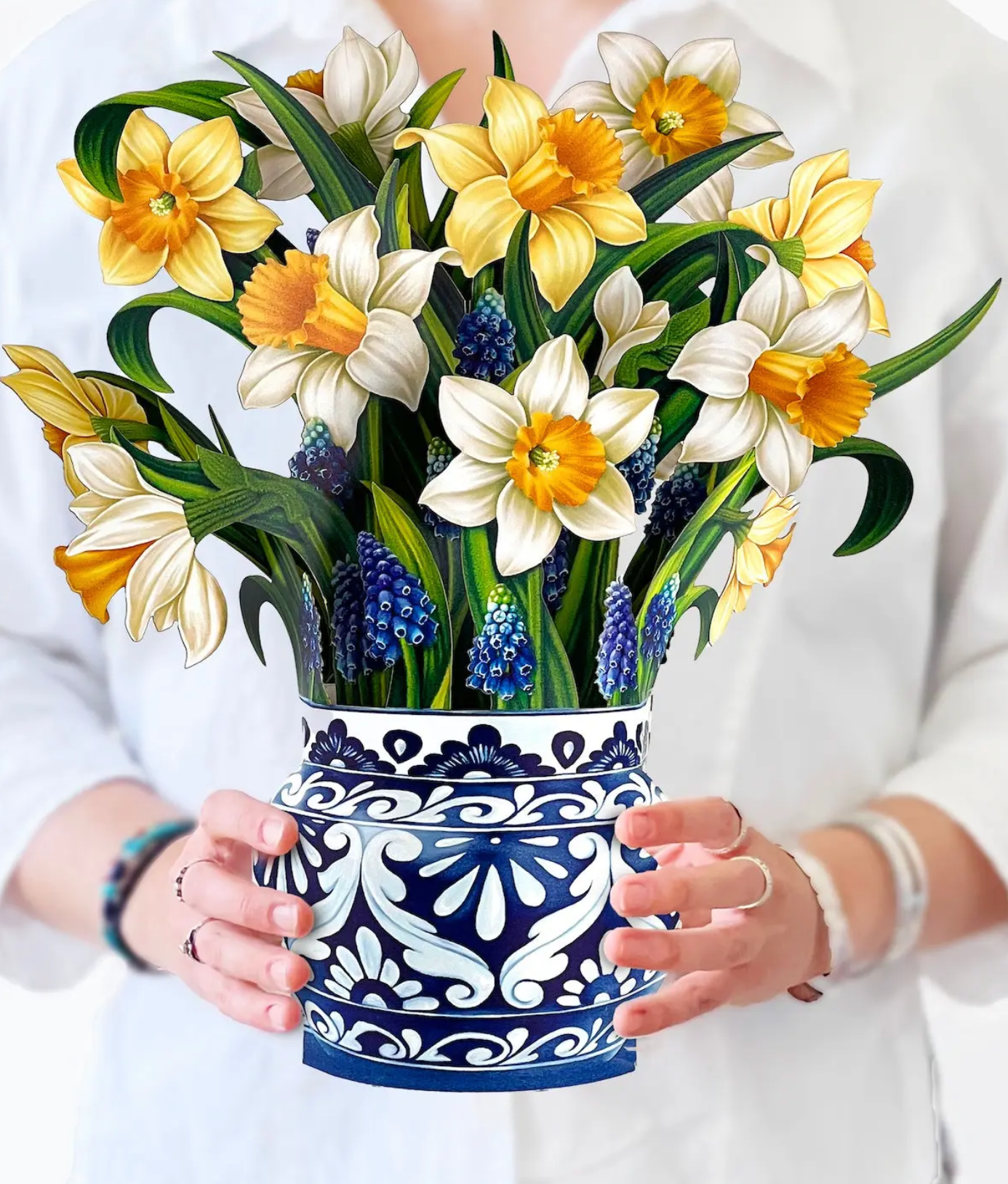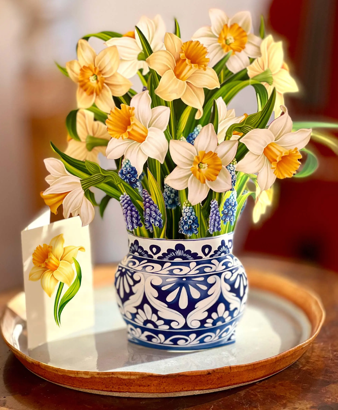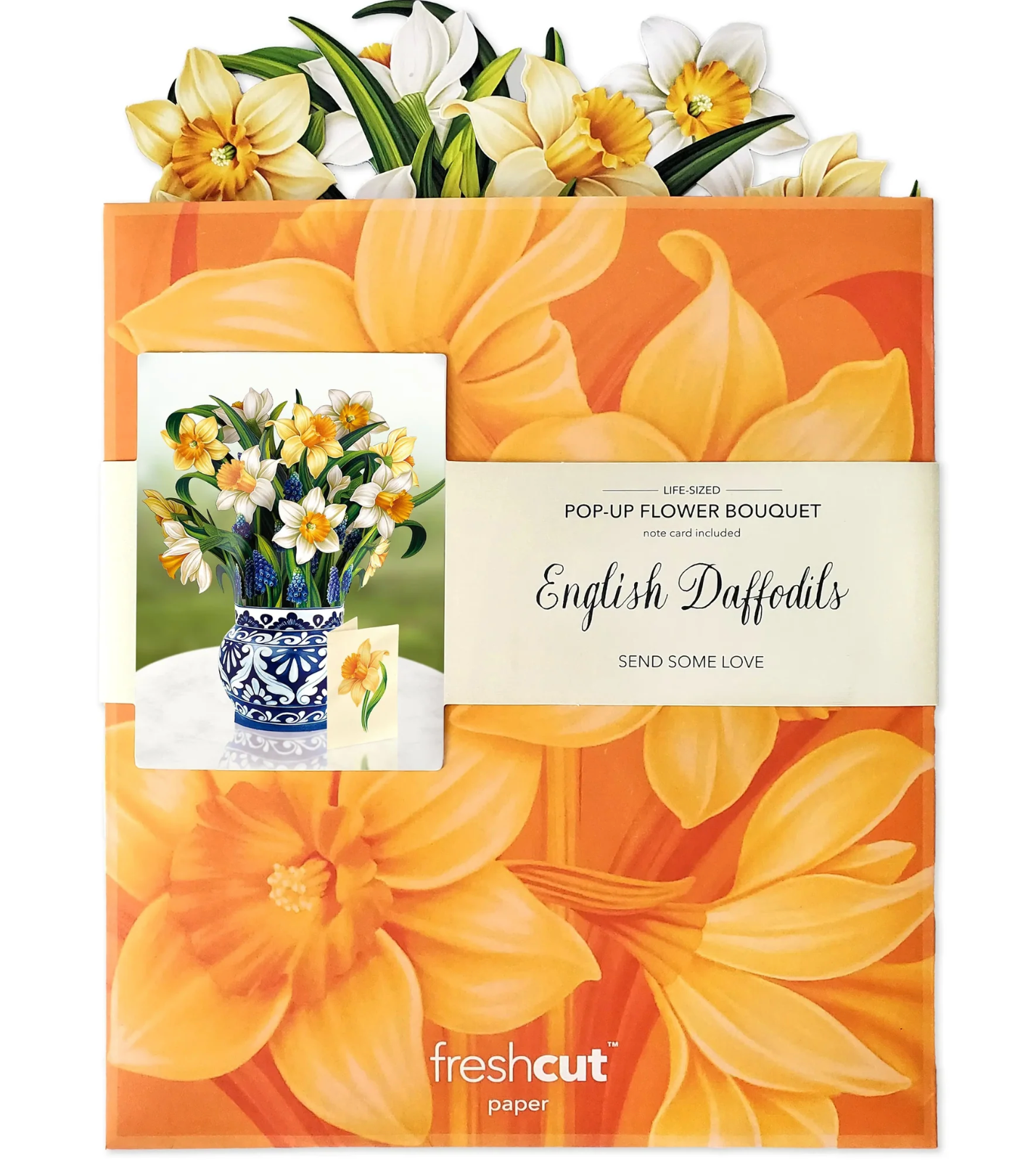A pop up bouquet of FreshCut Paper Daffodils is a delightful greeting card celebration of uplifting emotions and support