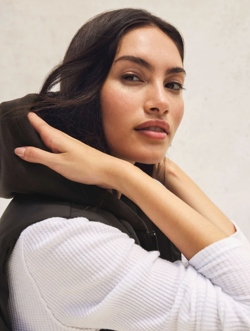 Lightweight yet warm, this hooded puffer blends smooth nylon taffeta with cozy cotton french terry panels for a soft-meets-structured feel. Finished with a hidden zip and snap placket, it’s perfect for crisp morning walks and city strolls.