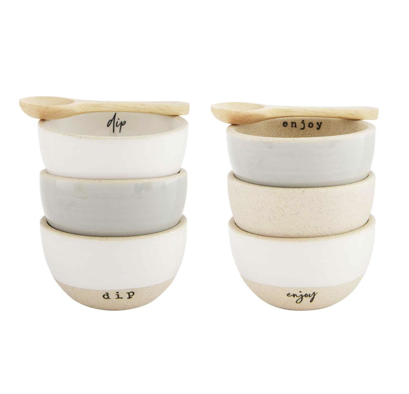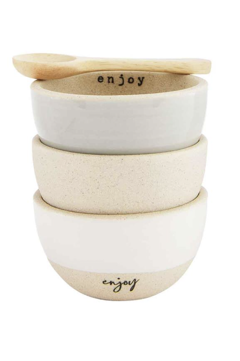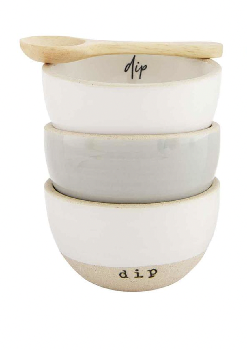 4-piece set. Set of three stoneware dip ramekins. Comes with wood spoon.