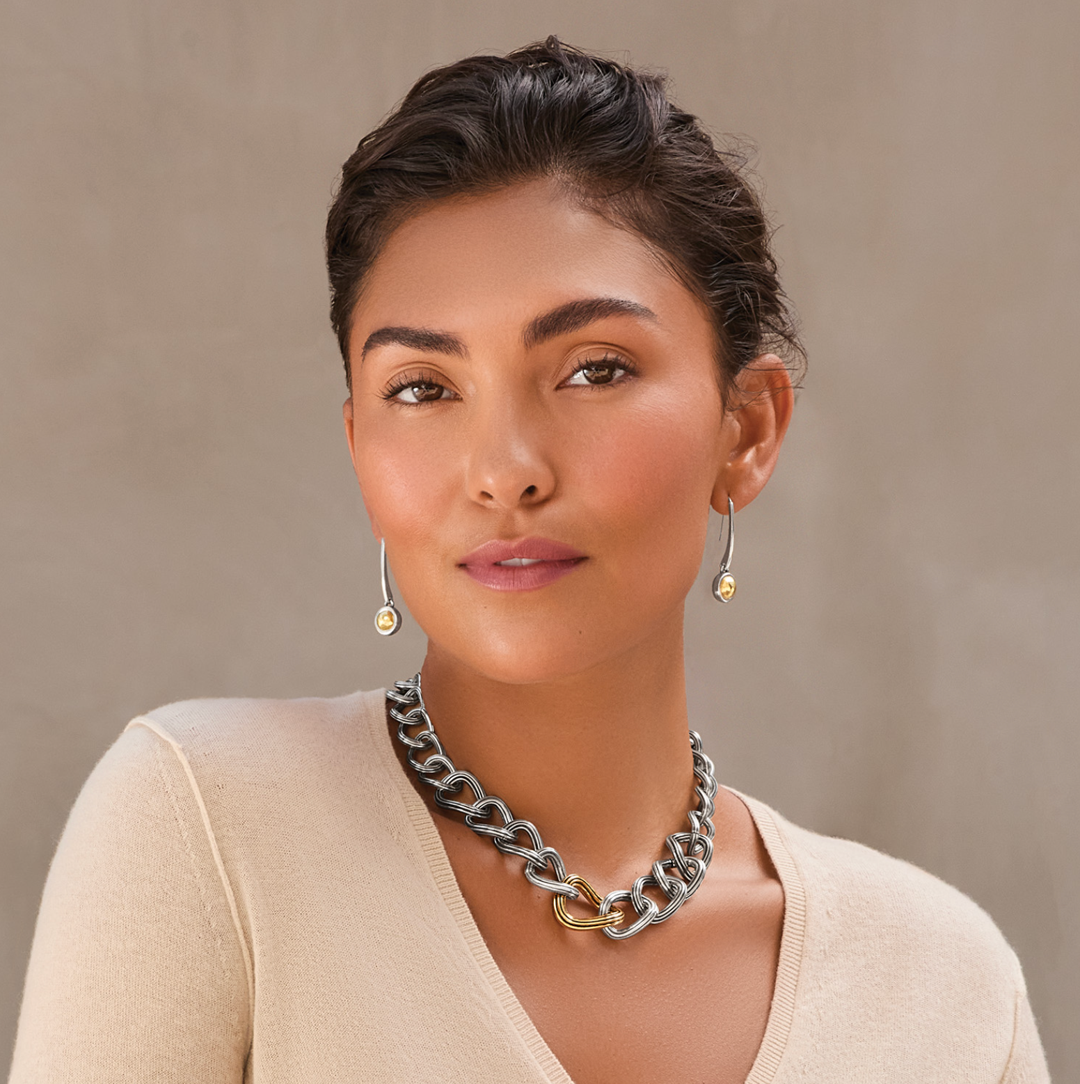 Inspired by the twisted columns of ancient Rome, each link is forged with dimensional depth—bold yet refined, fluid yet structural. The interplay of silver and gold creates a striking contrast, emphasizing the chain’s dynamic movement and timeless silhouette. Eterna speaks to continuity through form, balancing heritage with contemporary edge.