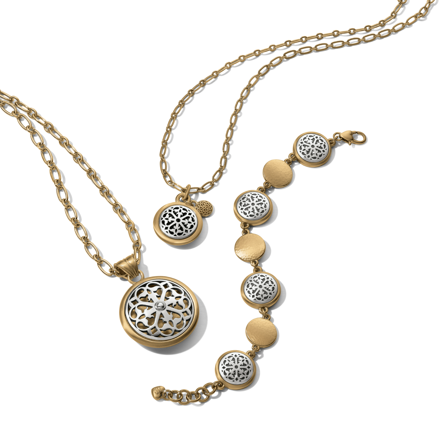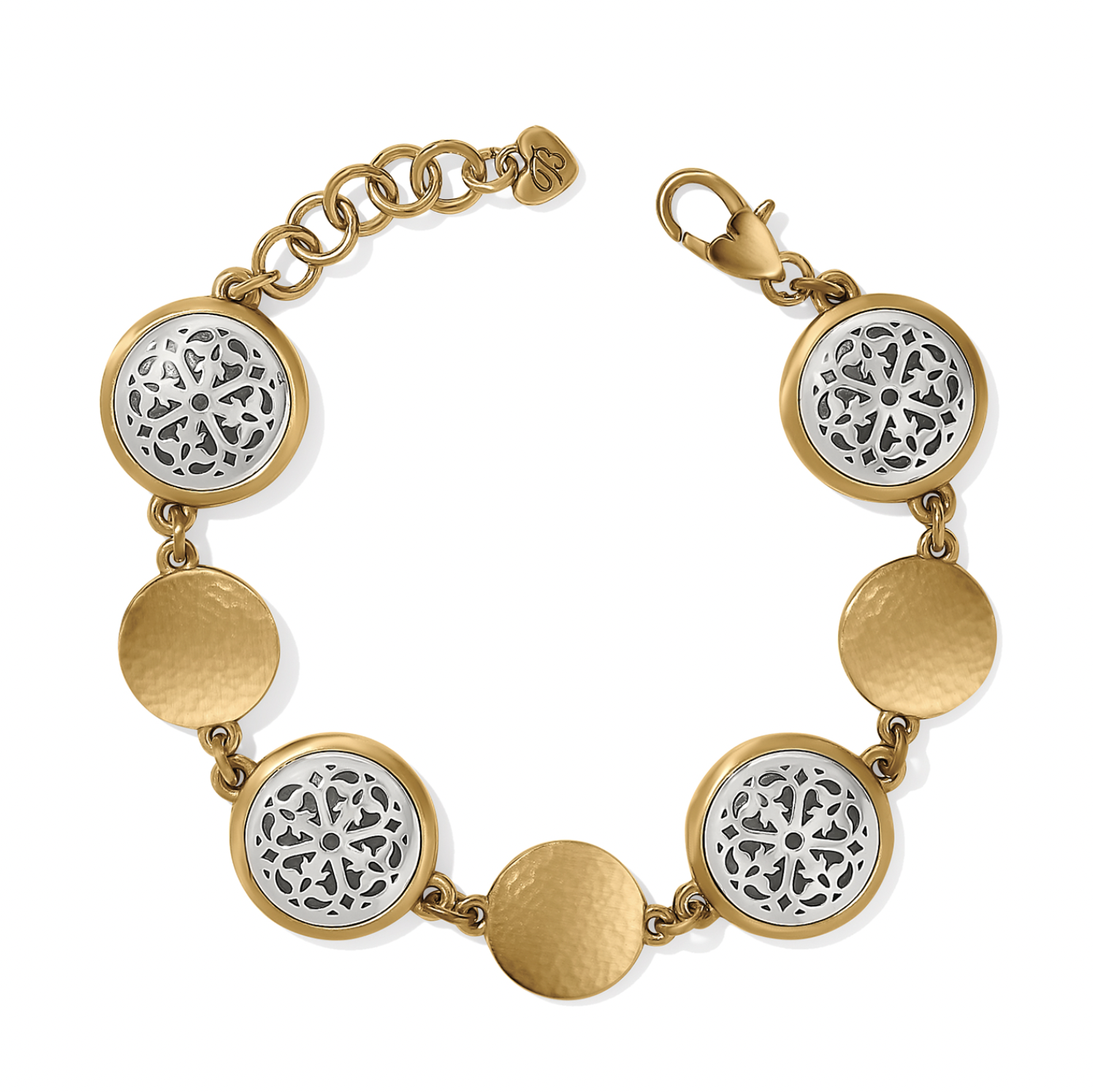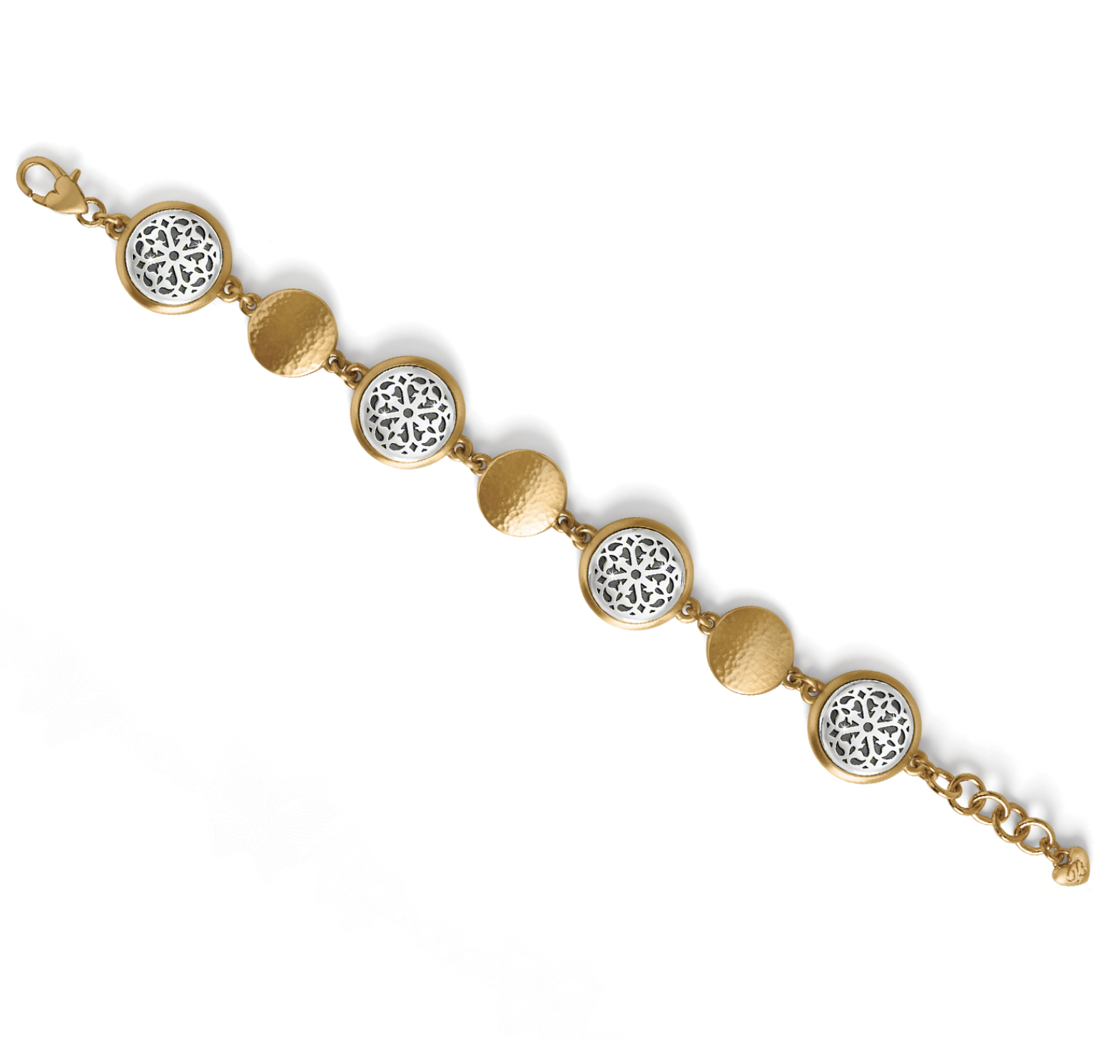 Engraved, hammered and two-tone, this bracelet inspired by rose windows of 12th century European cathedrals has a handmade silversmith flair.