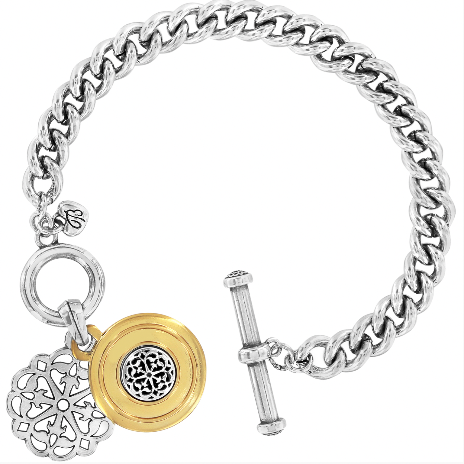 Hanging from a chunky chain, a high-shine and brushed gold Ferrara medallion toggle bracelet features a pendant made from the signature Ferrara pierced medallion dangling against an engraved brushed gold medallion.
