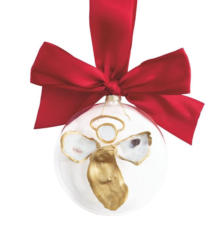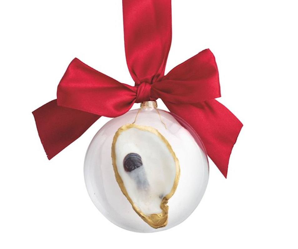 Glass ornament features layered natural oyster shells with ribbon hanger.