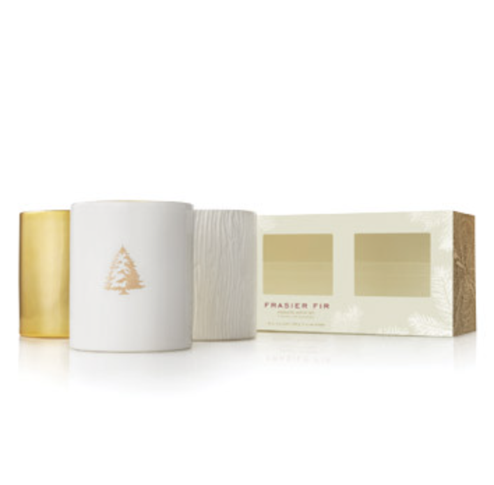 Fill your surroundings with Frasier Fir with these three assorted ceramic candles complimenting each other with winter whites, wood grains, and glistening gold.