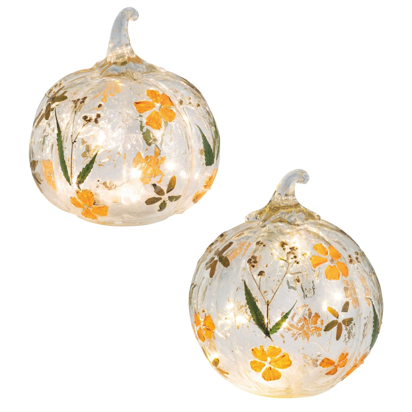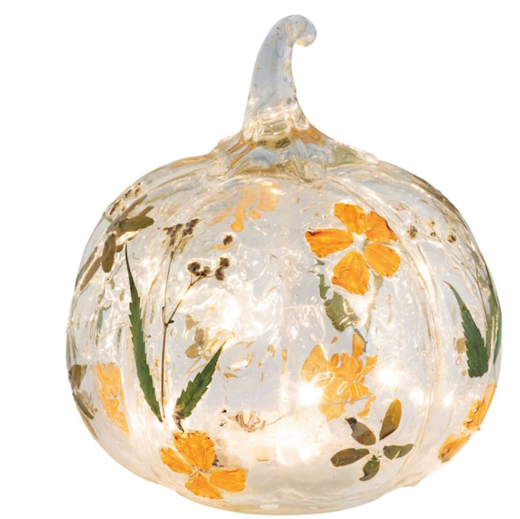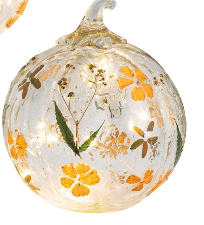 Pressed flower glass pumpkin sitter features light-up detail. Requires 3 AAA batteries, not included.