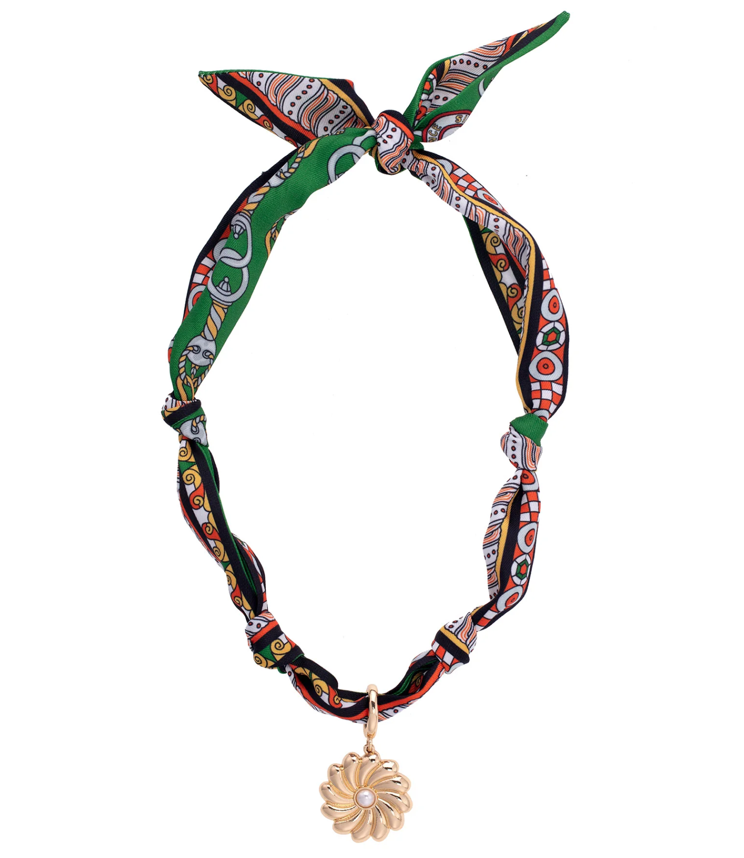 Gertrude Pearl Flower Scarf Necklace in Green/Black/Orange