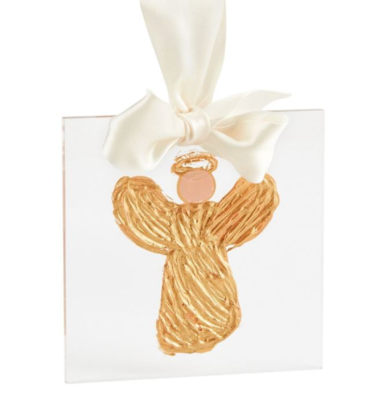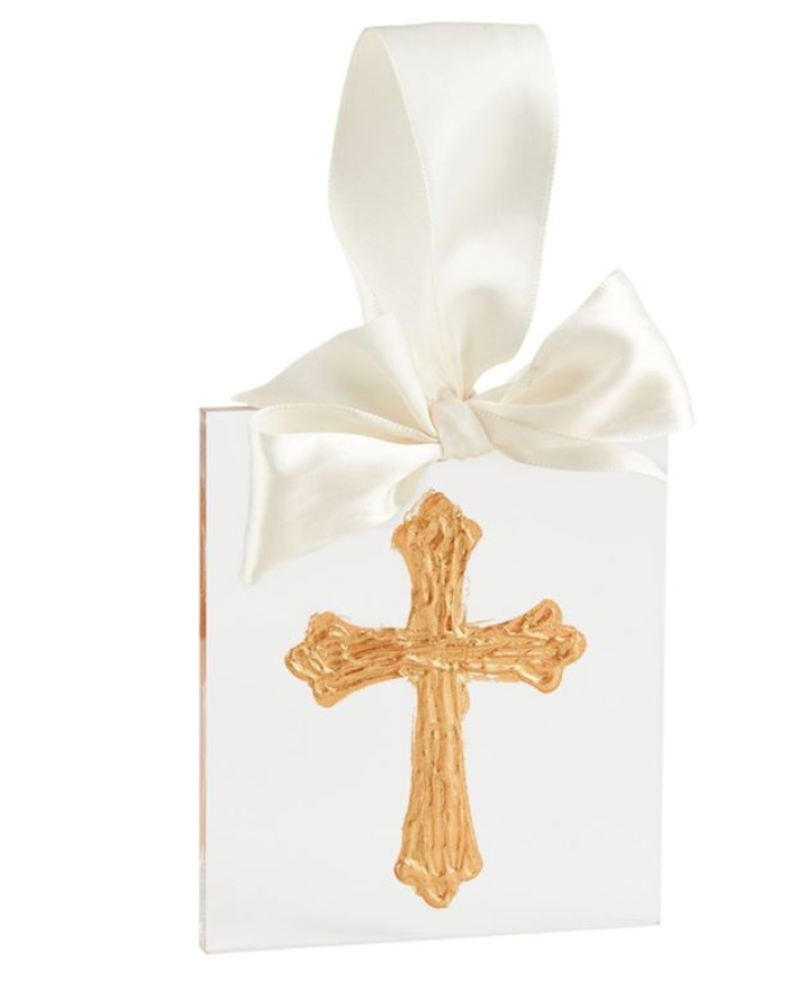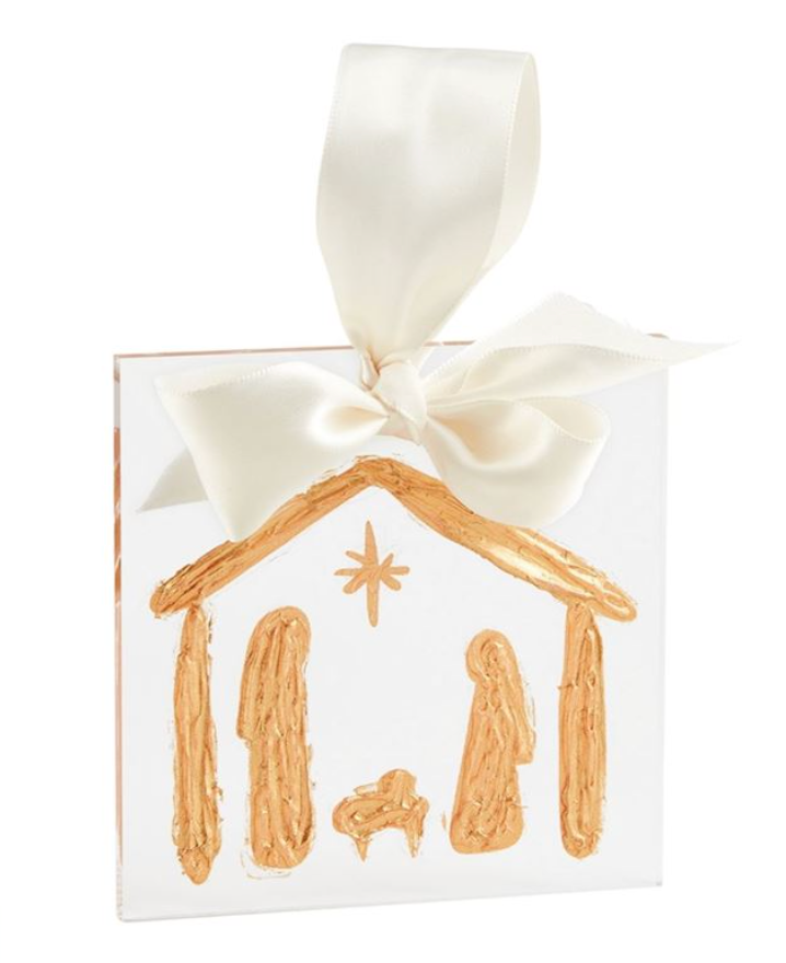 Hand-painted acrylic plaque ornament with satin ribbon hanger.
